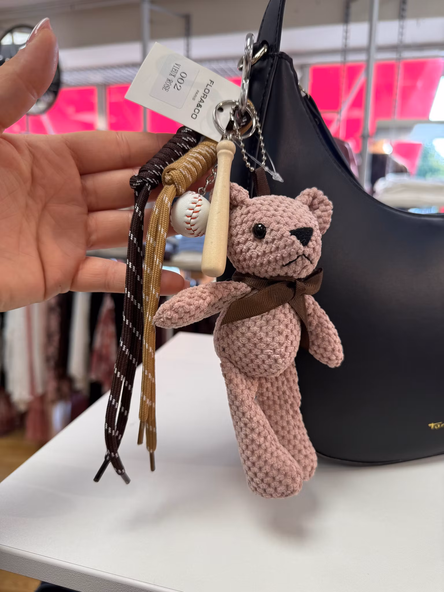 Söt virkad nalle som fungerar både som nyckelring och väskhänge. Tillverkad i mjukt garn med en liten rosett runt halsen som extra detalj. Kommer med karbinhake och kedja så att du enkelt kan fästa den på väska, ryggsäck eller nyckelknippa.