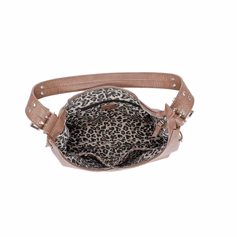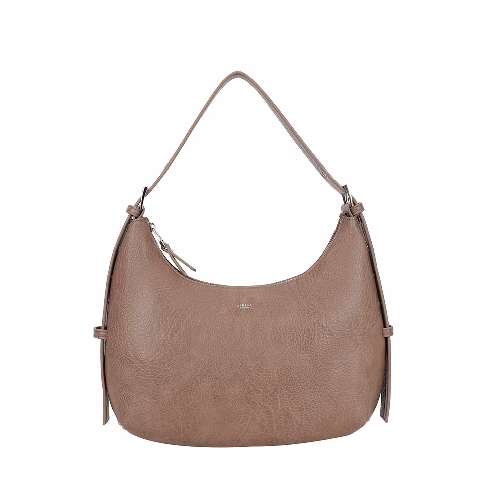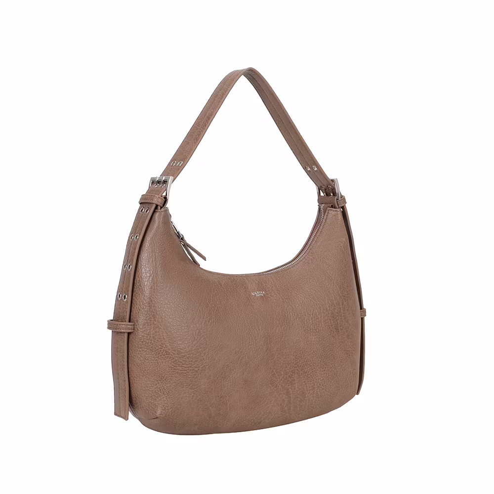 Denna eleganta taupefärgade axelväska i högkvalitativt veganskt läder är det perfekta valet för dig som vill kombinera stil, funktion och hållbarhet. Med sin klassiska hobo-modell och justerbara axelrem med dekorativa metallspännen får väskan en modern och trendig look som passar både till vardag och fest.