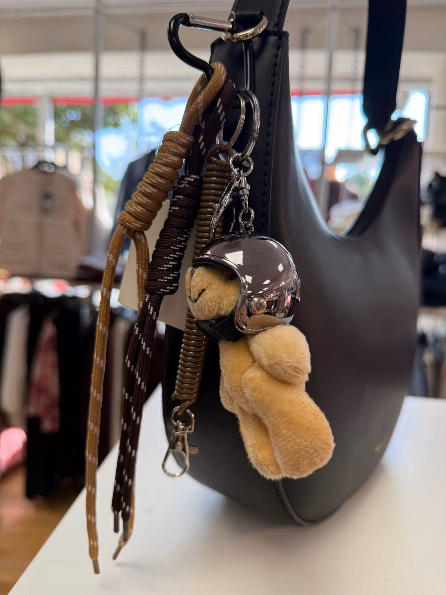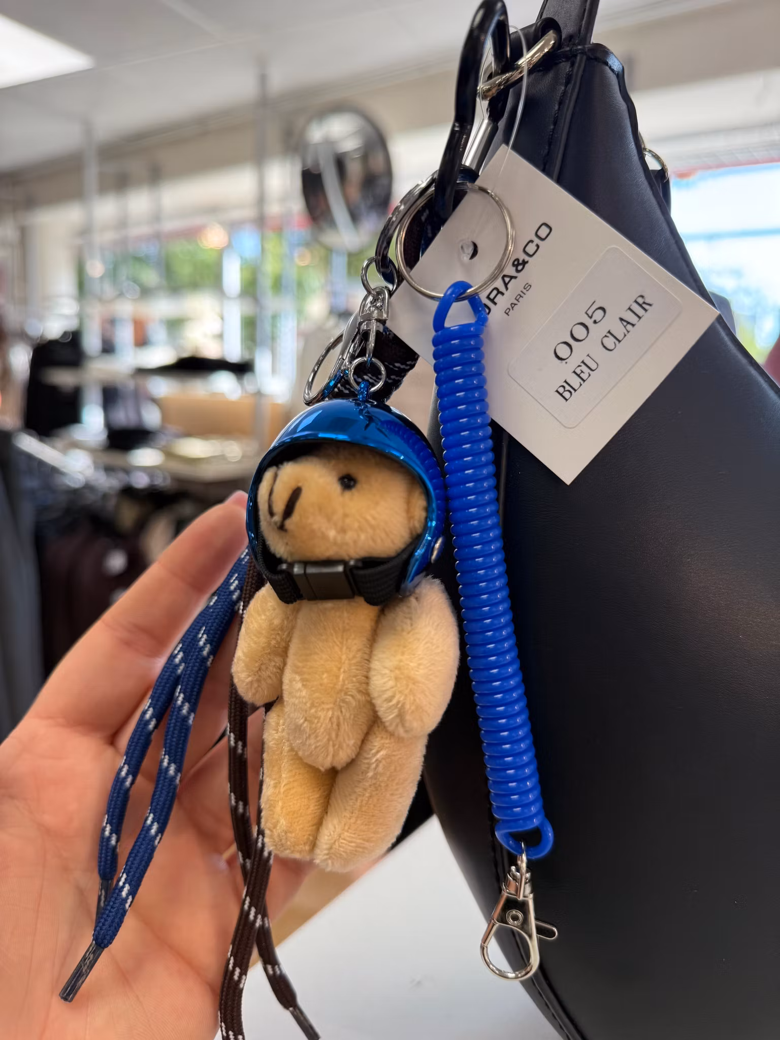 Unik och lekfull accessoar som garanterat sticker ut! Denna mjuka björn är utrustad med en liten hjälm i olika färger och mönster – perfekt som både nyckelring och väskdekoration.