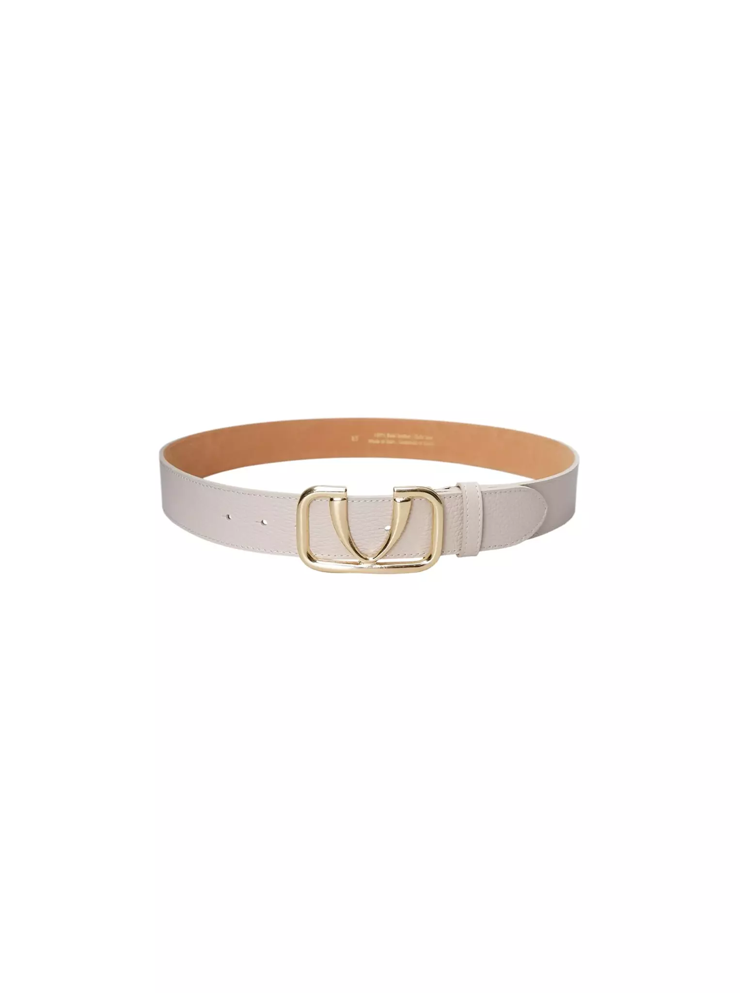 Ett elegant ljusbeige bälte som ger en sofistikerad finish till både vardags- och mer uppklädda outfits. Bältet är tillverkat i ett slätt material med lätt struktur och har ett guldfärgat spänne som tillför en exklusiv känsla. Den neutrala färgen gör bältet enkelt att matcha med byxor, jeans, klänningar och kjolar.