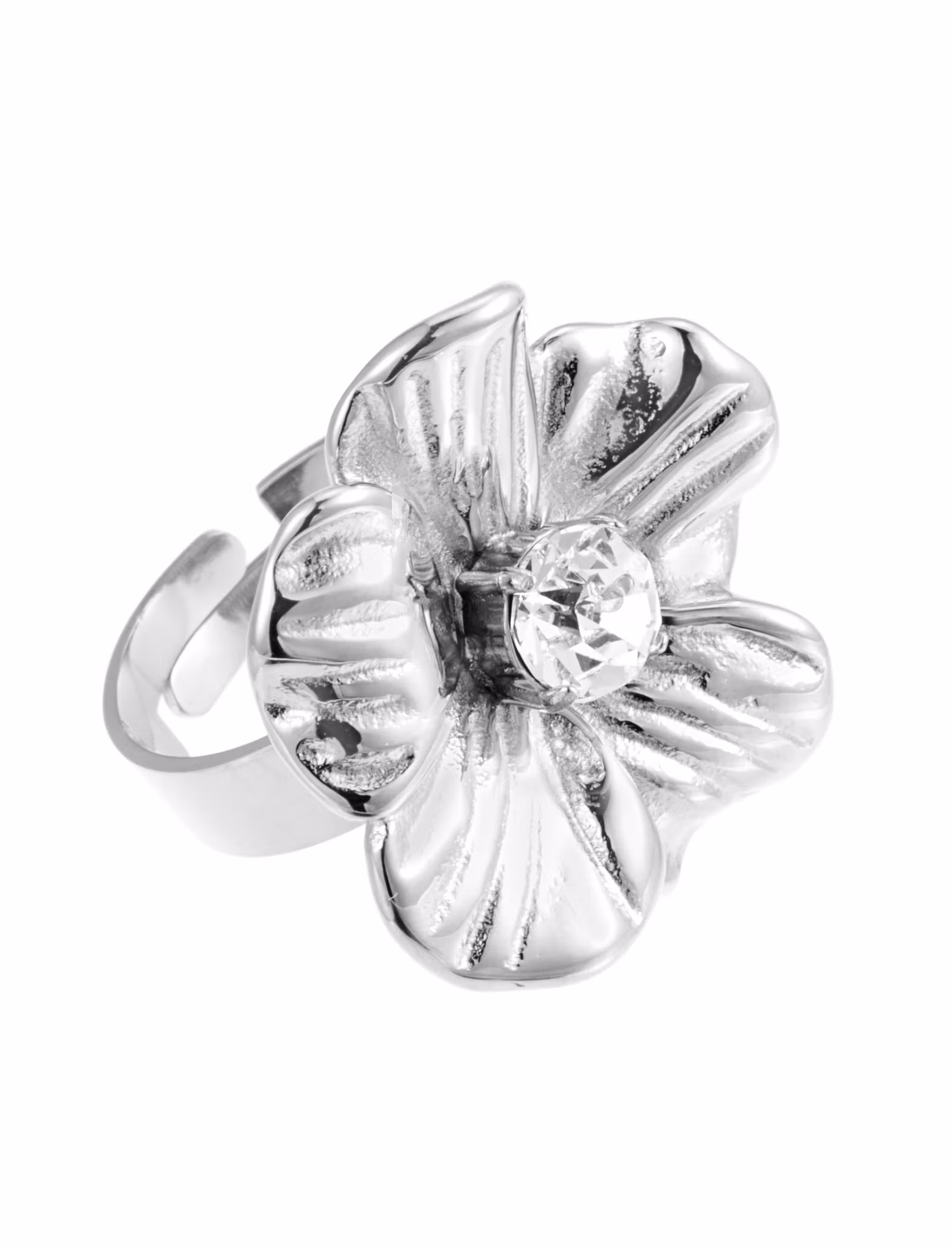 Denna eleganta ring pryds av en vackert formad blomma med en gnistrande sten i mitten som fångar ljuset på ett subtilt och lyxigt sätt. De mjukt skulpterade detaljerna ger ringen en feminin och sofistikerad känsla. Ringen är justerbar för en bekväm passform och blir ett stilfullt smycke som tillför en elegant och exklusiv touch till både vardag och fest.