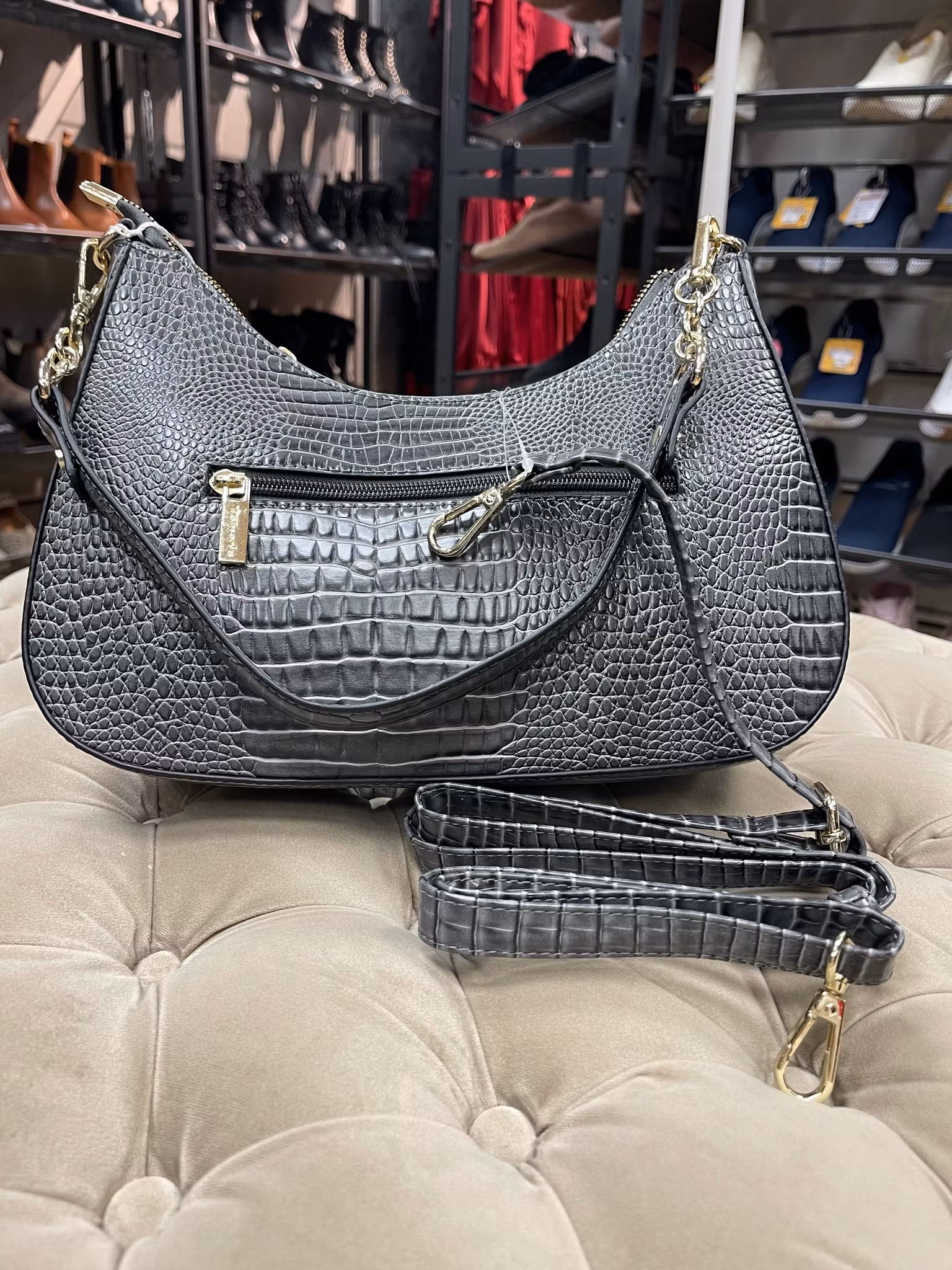 Lyft din vardagsstil med denna eleganta grå axelväska i krokodilpräglat konstläder. Väskan kombinerar sofistikerad design med praktisk funktion och passar lika bra till jobbet som till festliga tillfällen. Den mjuka, rundade formen ger ett modernt uttryck, medan det reptilinspirerade mönstret skapar en lyxig och tidlös look.