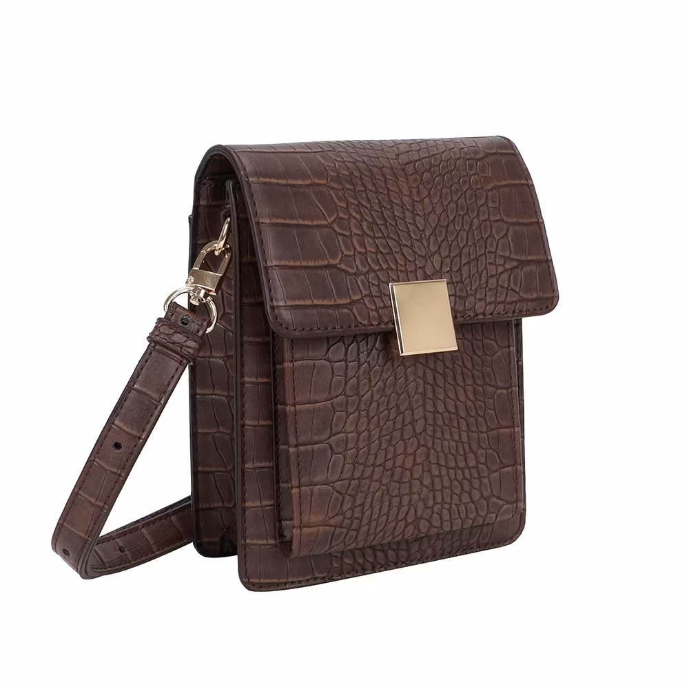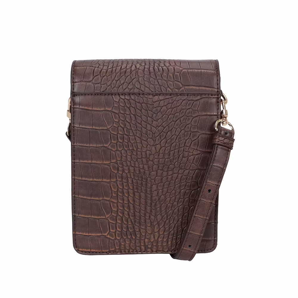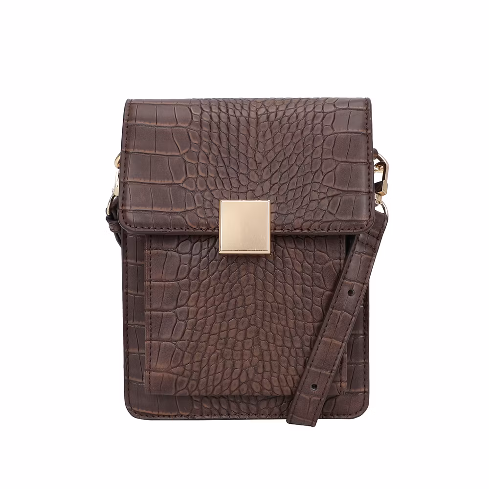 Stilren och praktisk box-handväska i mörkbrun skinnimitation med elegant krokopräglad struktur. Väskan har en justerbar axelrem och en guldfärgad spänndetalj framtill som ger en exklusiv touch. Perfekt när du vill bära mobil, kort och små tillbehör på ett smidigt och trendigt sätt.