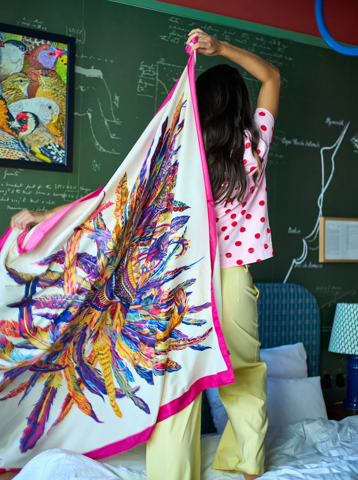 Denna stora scarf har ett iögonfallande mönster och ett färgstarkt helhetsintryck som ger den ett exklusivt och elegant uttryck. En dekorativ accessoar som tillför färg och liv till din garderob.