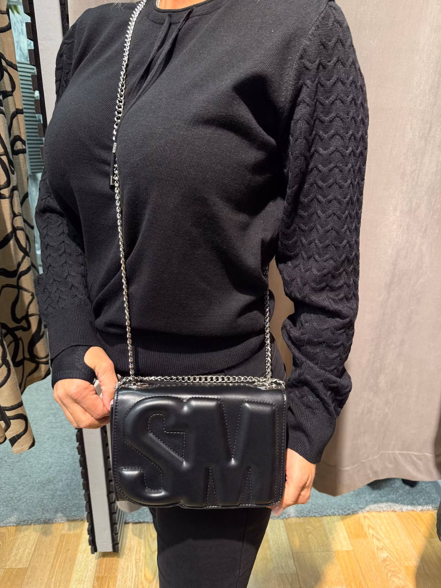 Den har en silverfärgad kedjerem som kan bäras både crossbody eller över axeln, vilket gör den både praktisk och stilren. Perfekt för både vardag och fest, då den rymmer mobil, plånbok, nycklar och andra småsaker du behöver ha med dig.