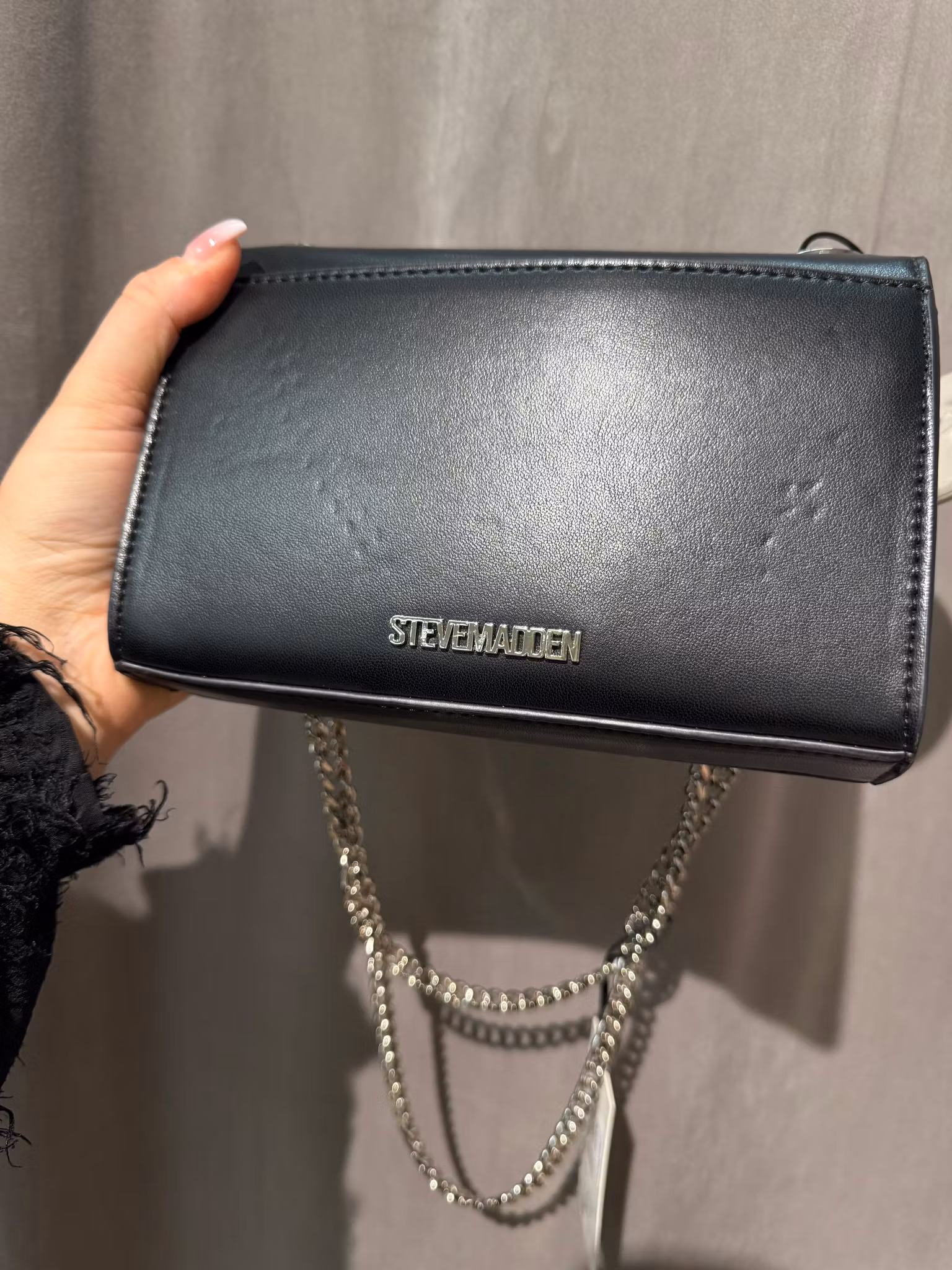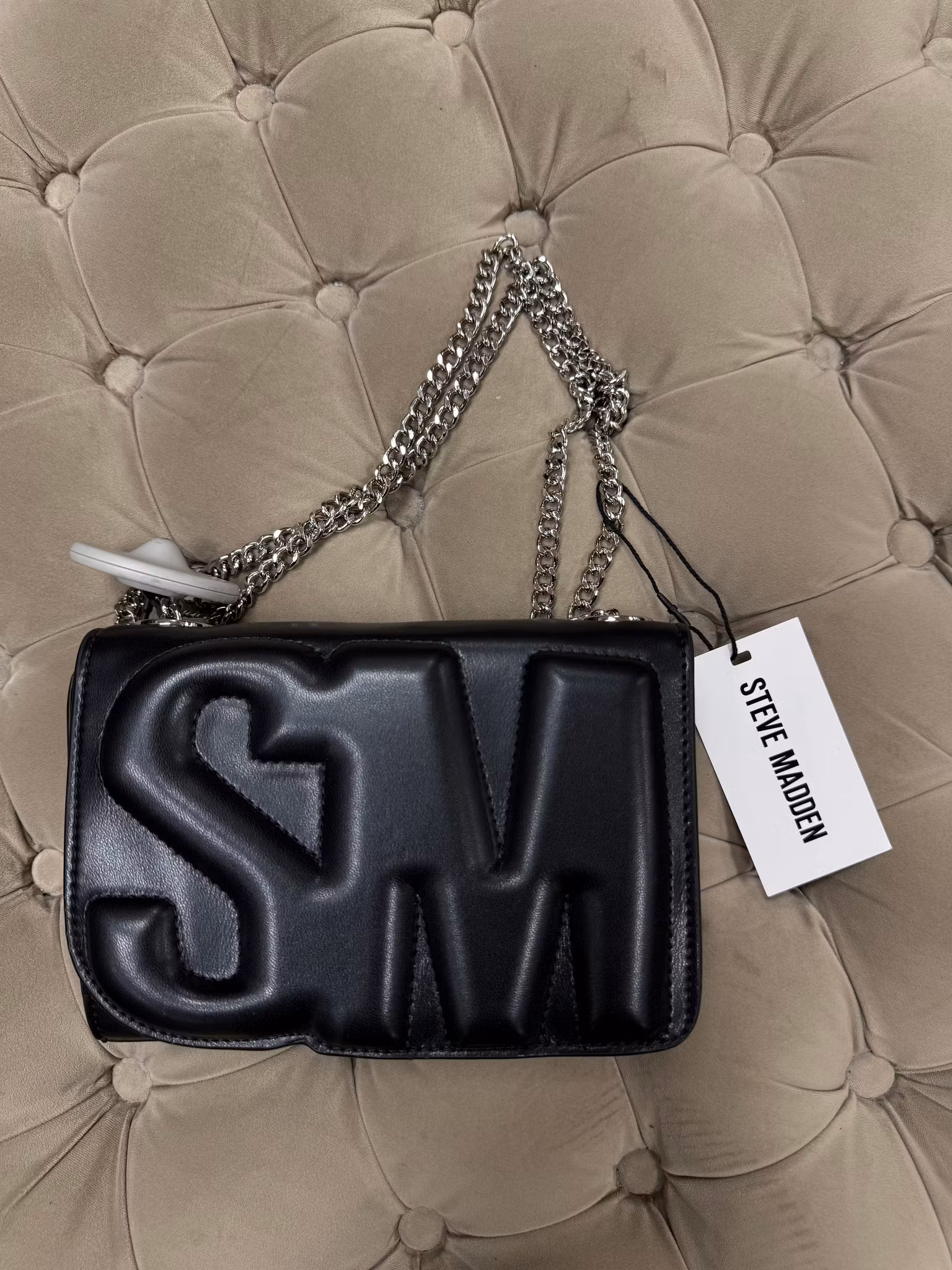 Ge din outfit en modern edge med denna trendiga Steve Madden axelväska. Väskan är tillverkad i svart veganskt läder med en unik 3D-design som framhäver bokstäverna SM på framsidan – en stark signaturdetalj för varumärket.