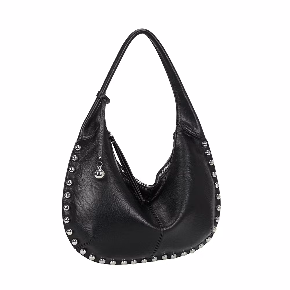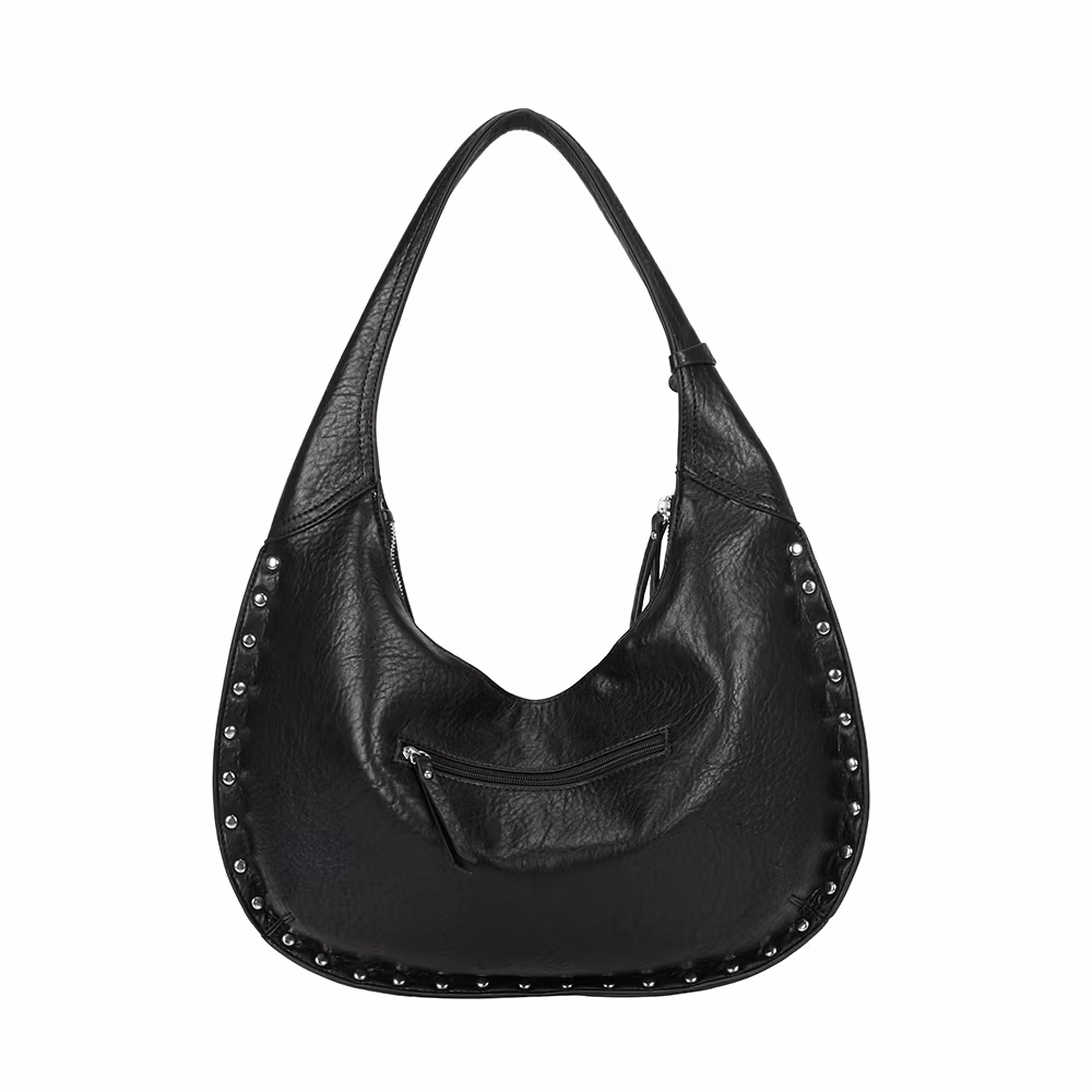 Trendig hobo-väska i svart skinnimitation med dekorativa silverfärgade nitar längs kanterna. Väskan har en mjuk och rymlig design som gör den perfekt för vardagsbruk, samtidigt som den ger en edgy och modern look. Bär den bekvämt över axeln för en avslappnad men stilfull outfit. En mångsidig damväska som kombinerar funktionalitet med trendig design – perfekt för dig som vill sticka ut med dina accessoarer.