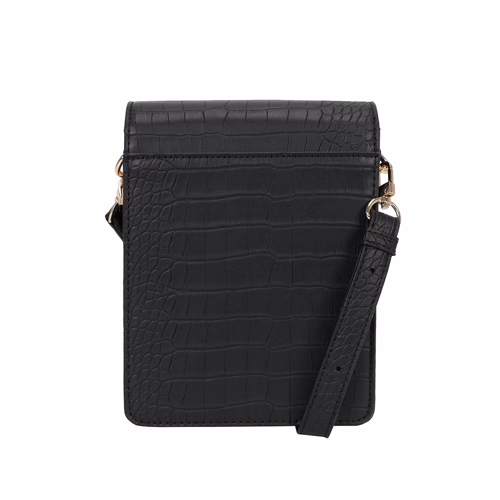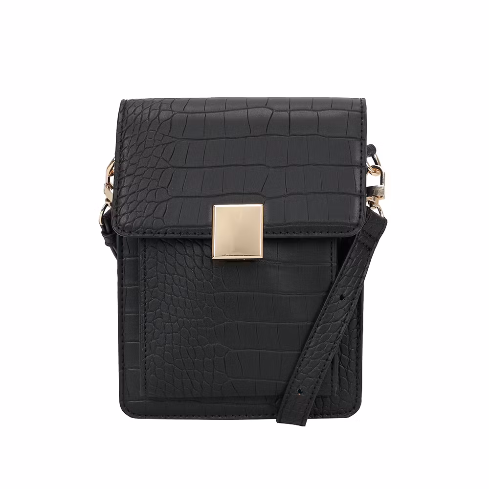 Stilren och praktisk box-handväska i svart skinnimitation med elegant krokopräglad struktur. Väskan har en justerbar axelrem och en guldfärgad spänndetalj framtill som ger en exklusiv touch. Perfekt när du vill bära mobil, kort och små tillbehör på ett smidigt och trendigt sätt.