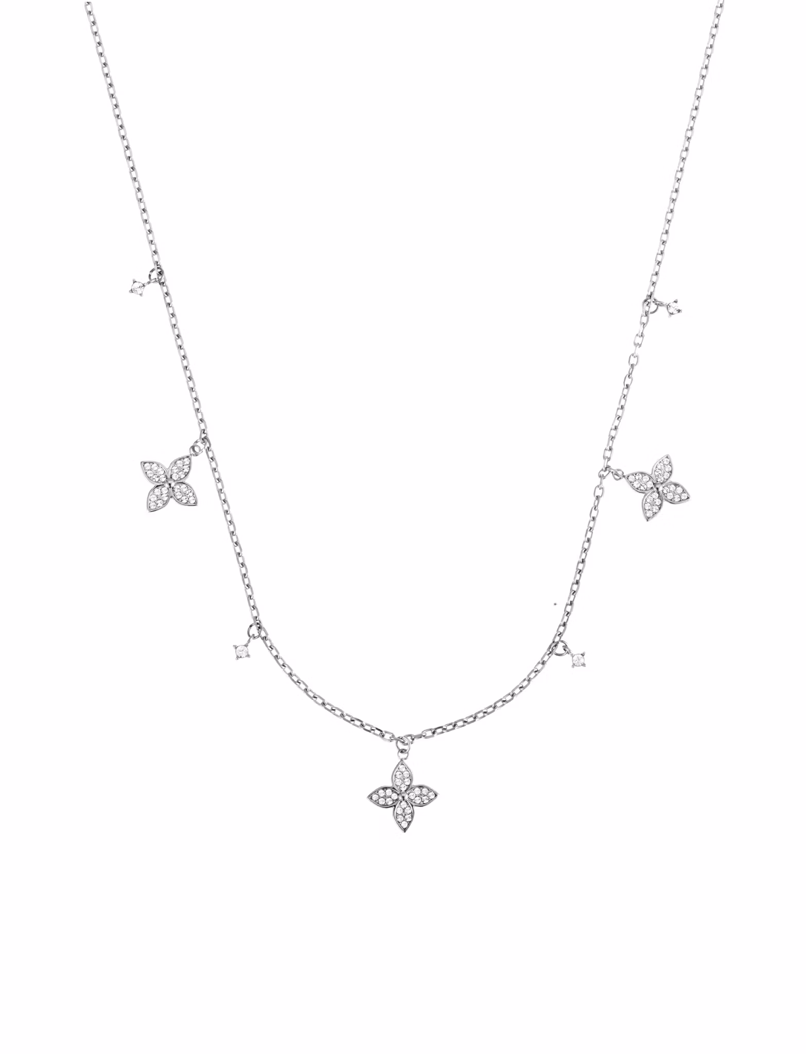 Detta eleganta halsband pryds av flera små detaljer med gnistrande stenar som skapar ett vackert och livfullt uttryck. Den stilrena kedjan ger ett lätt och feminint fall runt halsen. Ett stilfullt smycke som tillför en sofistikerad touch till både vardag och fest.