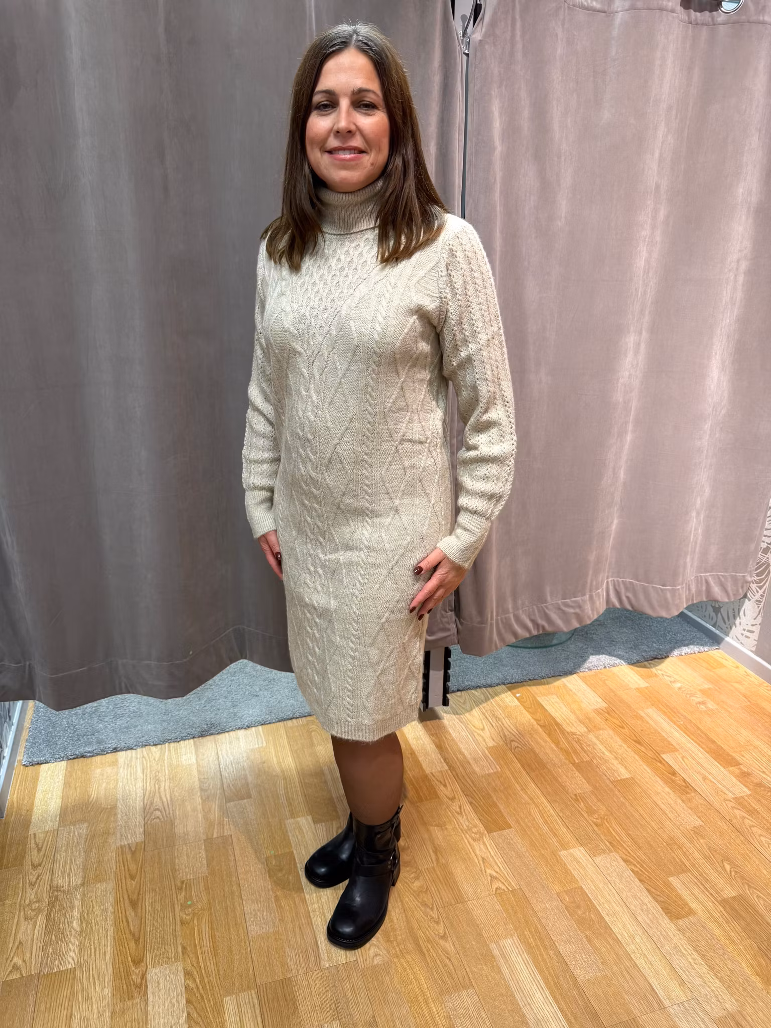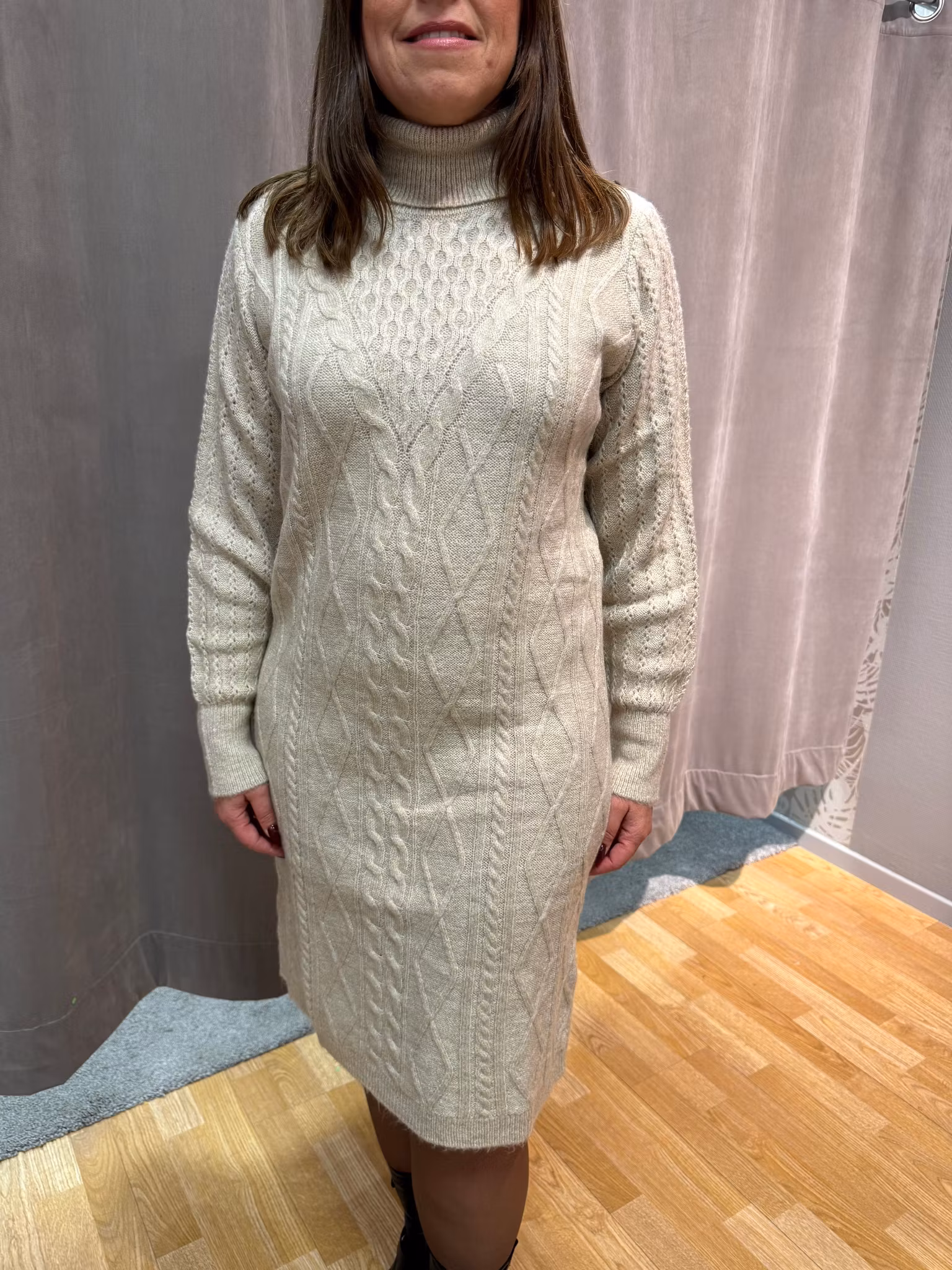 En mysig och elegant stickad klänning i klassisk beige nyans, perfekt för höst och vinter. Klänningen har en värmande polokrage, långa ärmar och ett vackert kabelstickat mönster som ger en tidlös och feminin look.