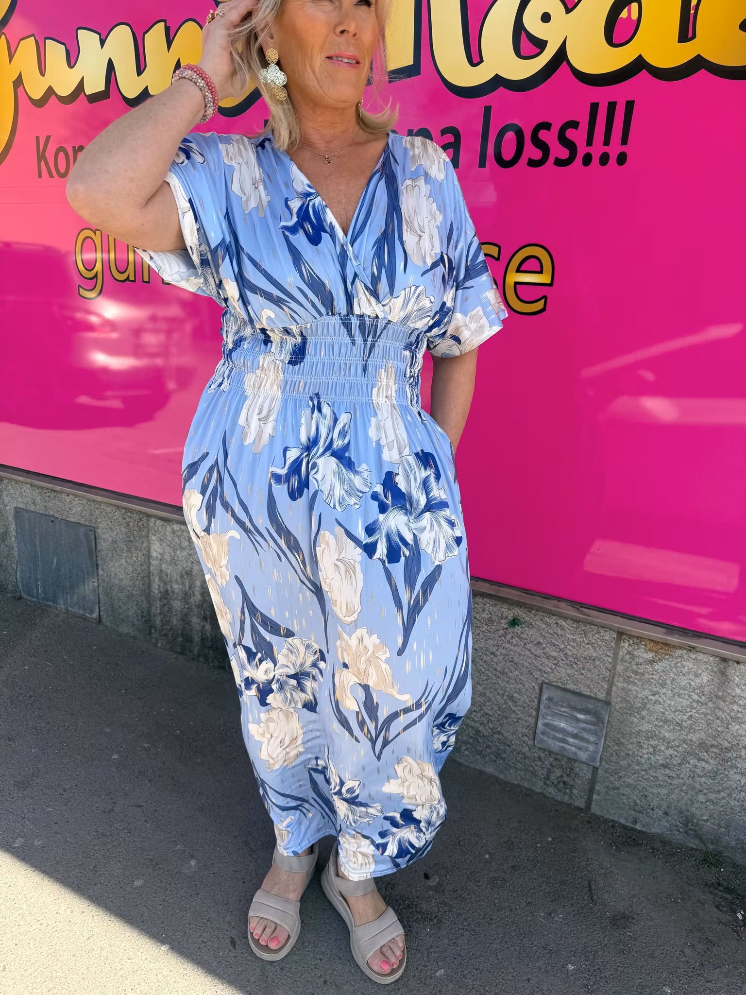 En luftig och stilfull maxiklänning med ett vackert blommönster där subtila gulddetaljer ger ett exklusivt och lyxigt intryck. Den smickrande omlottliknande överdelen tillsammans med den breda resåren i midjan framhäver figuren på ett elegant sätt.