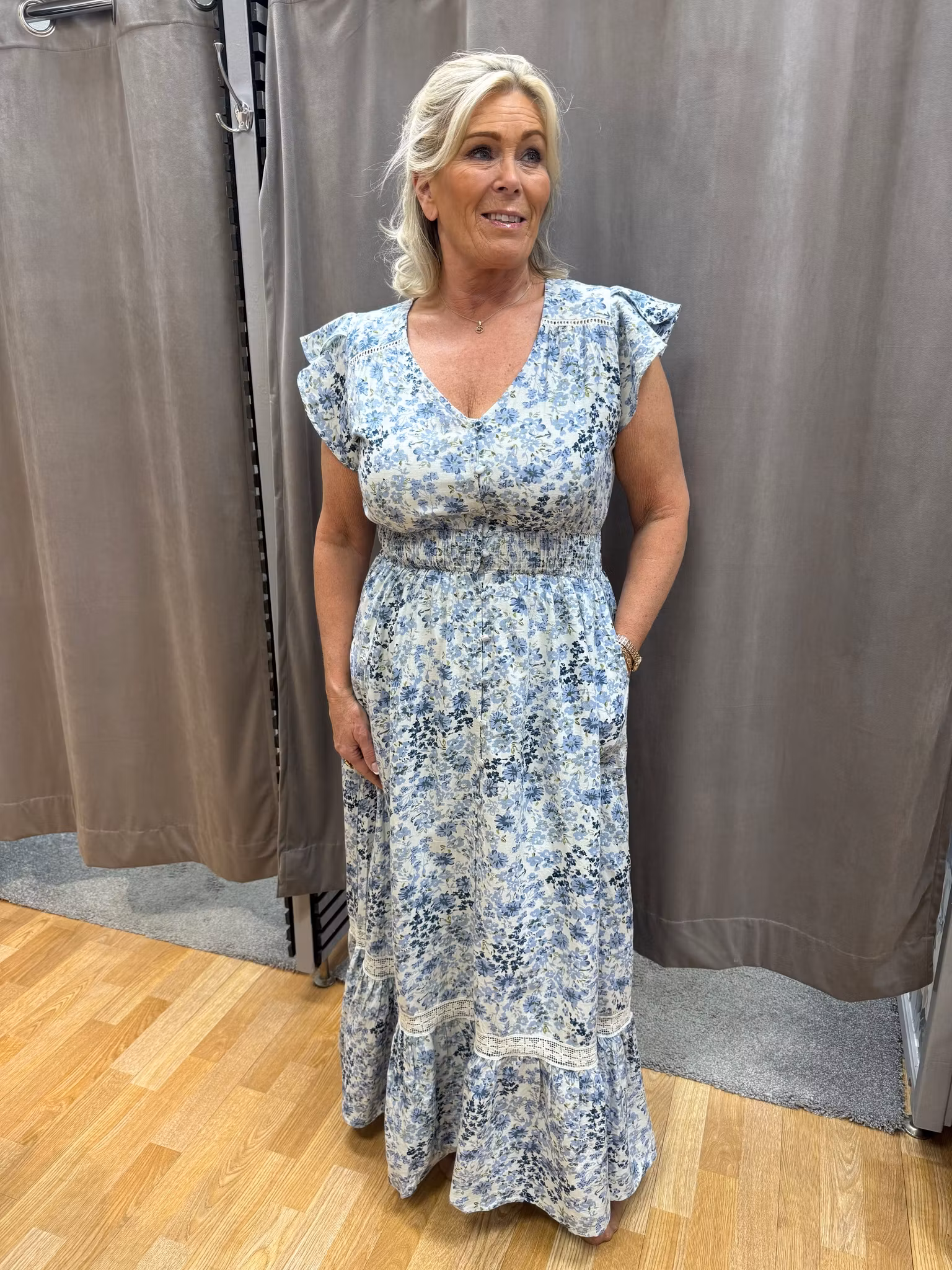 En romantisk och luftig maxiklänning i ett vackert ljusblått blommönster som passar perfekt till både vardag och fest. Klänningen har en smickrande smock i midjan som framhäver siluetten samtidigt som den är bekväm att bära hela dagen. De mjuka volangärmarna och den v-ringade halsen ger en feminin och elegant känsla.