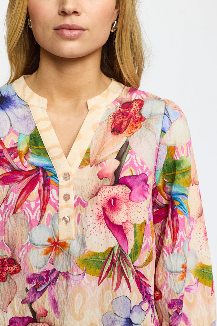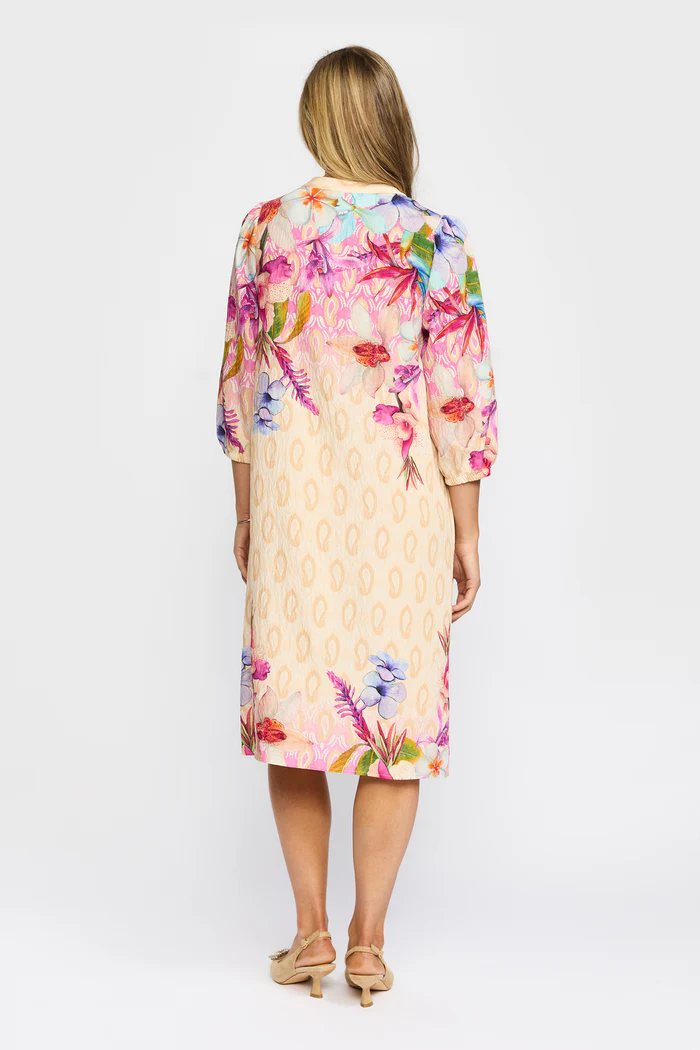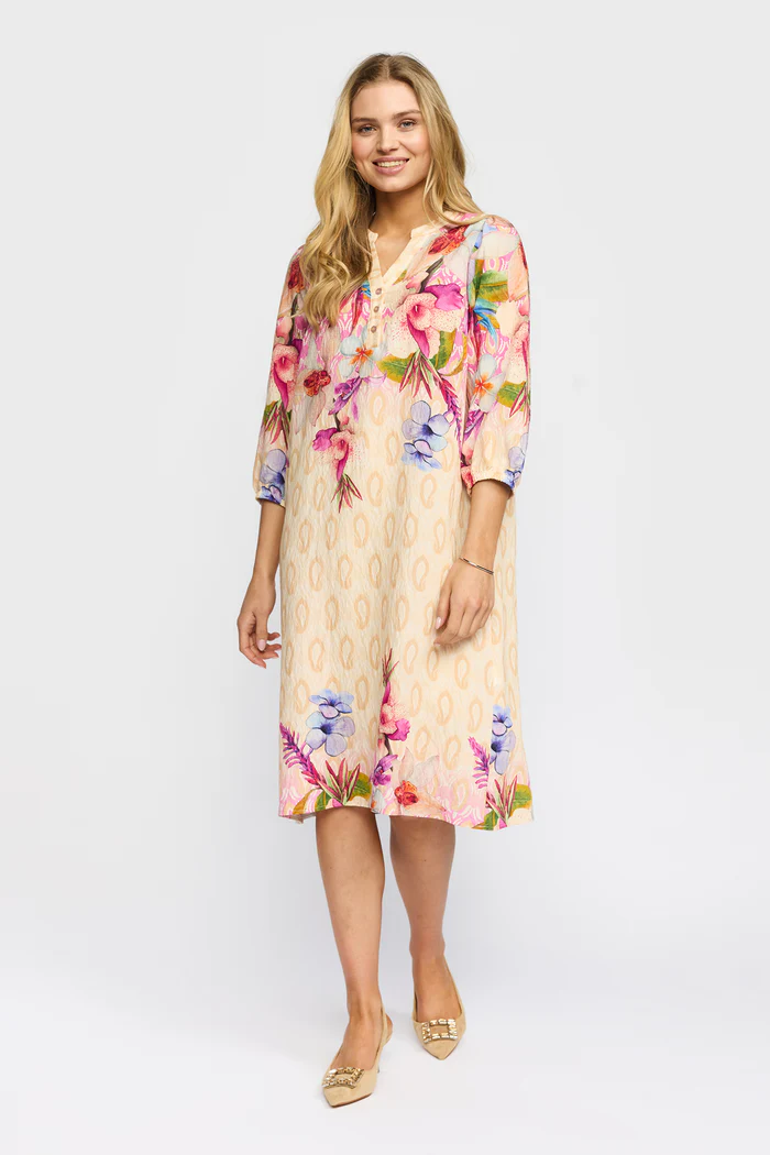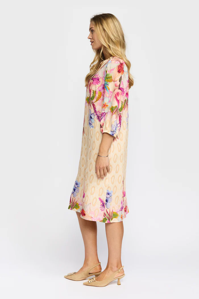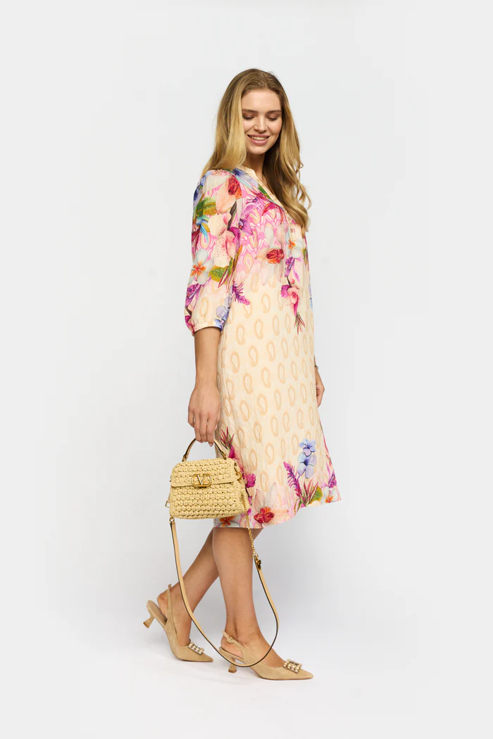 Den stilrena V-ringningen och de trekvartslånga ärmarna skapar en smickrande silhuett, medan det lätta materialet gör plagget perfekt för både varma dagar och lager-på-lager styling. Det subtila mönstret i kombination med de färgstarka blomdetaljerna ger klänningen ett unikt och levande uttryck.