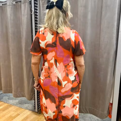 En blommig klänning i röda/rosa toner med plisserad överdel och underklänning. Något längre än knälång. Modellen är 172 cm och bär storlek L. Material: 100% polyester Underklänning: 96% viskos, 4% elastan