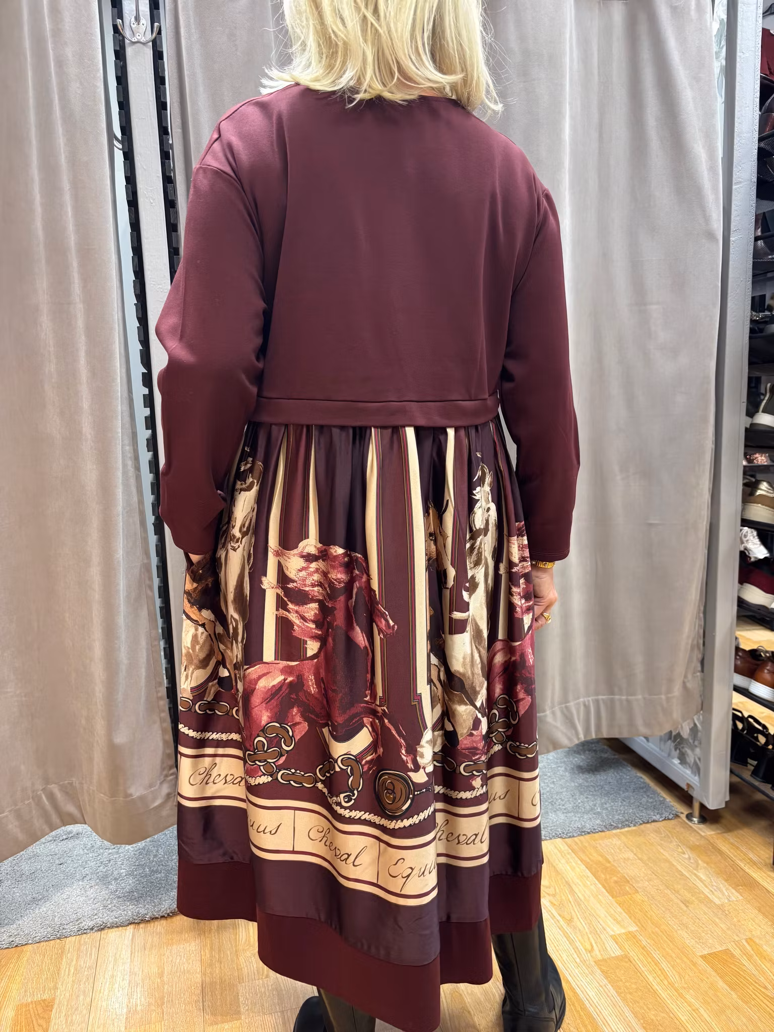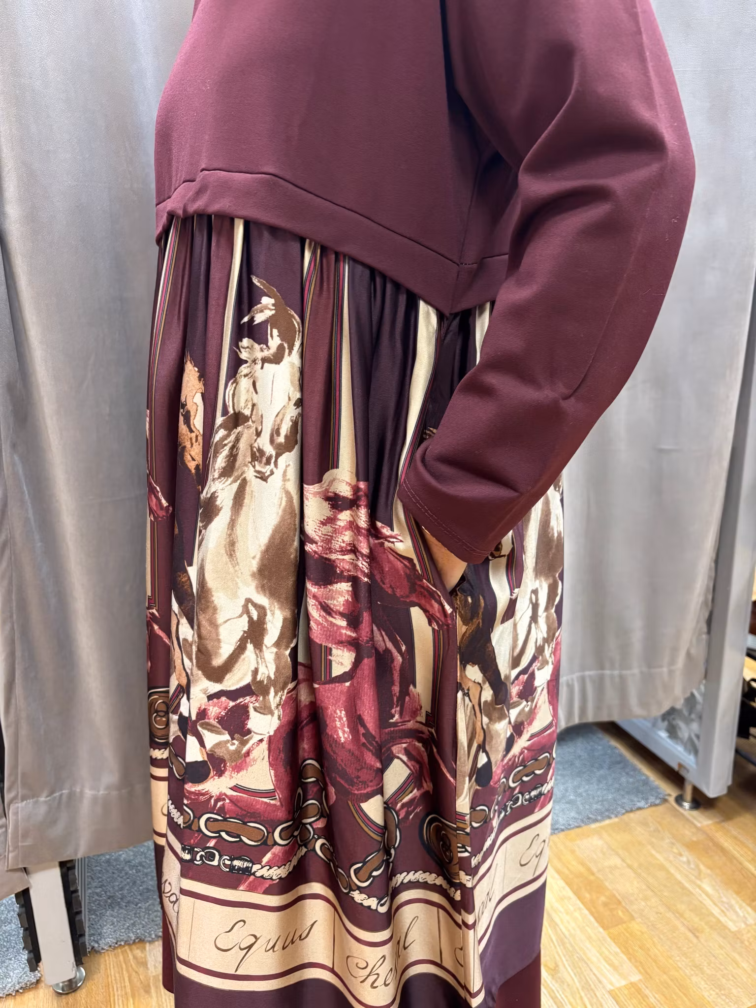 Stilsäker klänning med mjuk, enfärgad överdel och ett skirtparti i satäng med exklusivt mönster. Den avslappnade passformen tillsammans med rund halsringning och långa ärmar gör plagget bekvämt att bära samtidigt som det känns klätt. Skirtpartiet har vackra motiv i harmoniska toner vilket ger klänningen ett unikt och elegant uttryck. Den markerade sömmen i midjan skapar en smickrande siluett och ger fin rörelse i nederdelen. En perfekt klänning för både vardagsfint och festligare tillfällen.