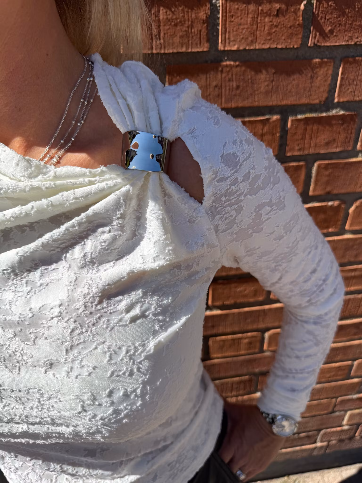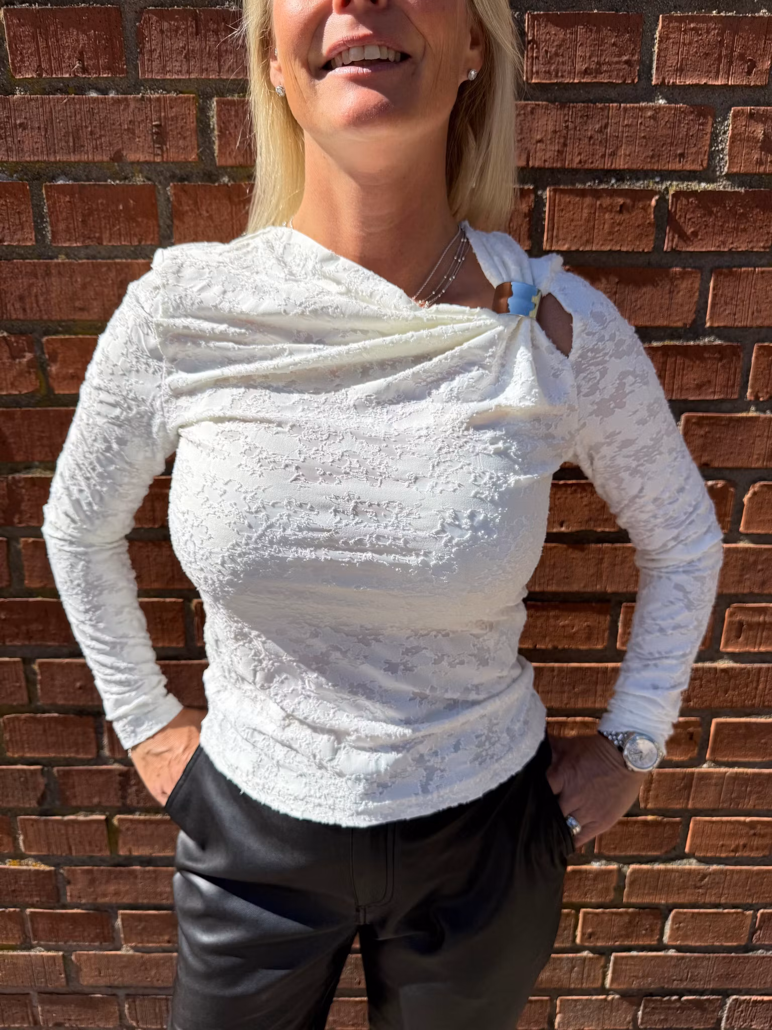 Trendig och feminin vit långärmad topp i spets med en elegant draperad urringning och unik cut-out detalj vid axeln. Perfekt att styla både till jeans, kjol eller skinnbyxor för en chic vardagslook eller en elegant kvällsstil. Den mjuka spetsen ger en sofistikerad känsla samtidigt som passformen framhäver figuren.