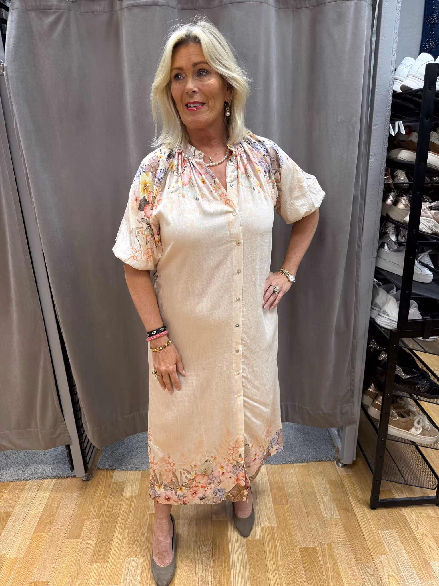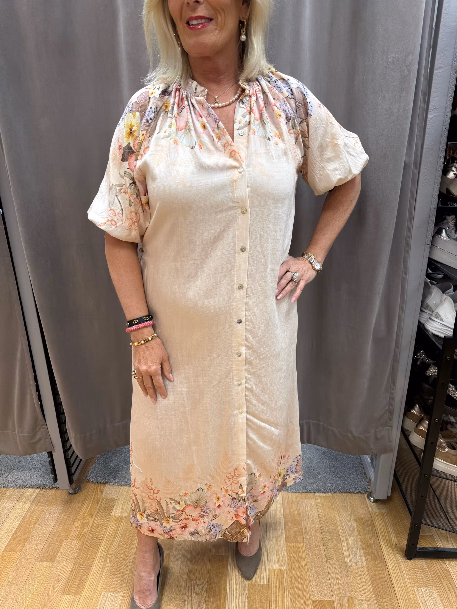 En feminin och elegant klänning i ett lätt, följsamt material med vackra blommiga detaljer. Modellen har en mjukt rynkad halsringning och korta, vida ärmar som ger ett luftigt och smickrande fall.