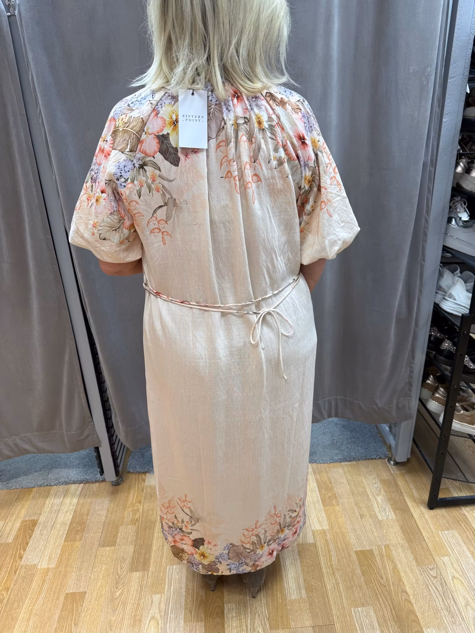 Klänningen är genomknäppt framtill och har en lös passform som enkelt kan justeras med det tunna knytbandet i midjan för en mer markerad siluett. Det subtila blommönstret upptill och längs nederkanten skapar en harmonisk och romantisk helhet.