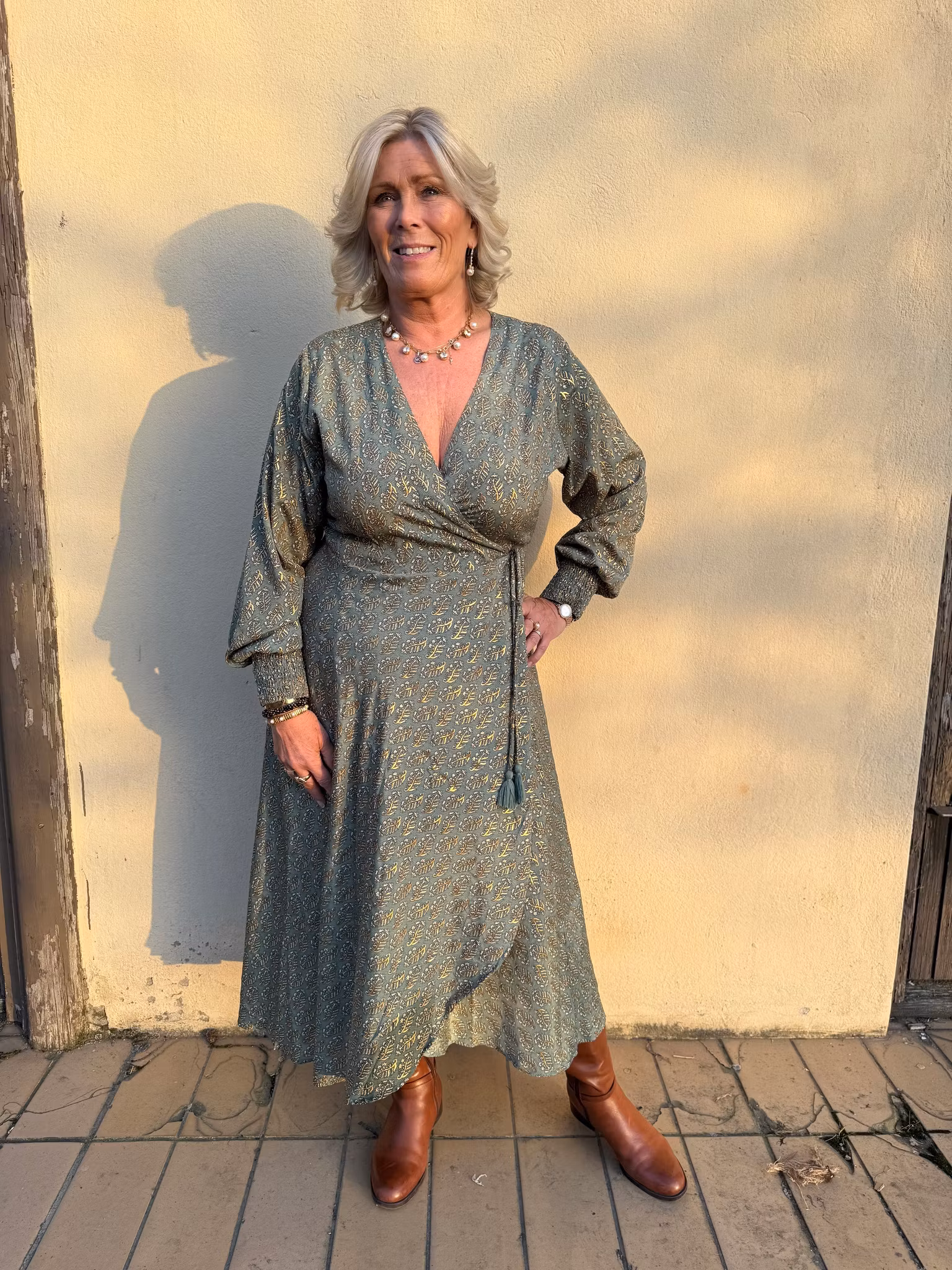 En elegant och feminin omlottklänning i en vacker grön nyans med dekorativt mönster i guldtoner. Den smickrande omlottdesignen framhäver midjan och skapar en fin siluett samtidigt som den är bekväm att bära.