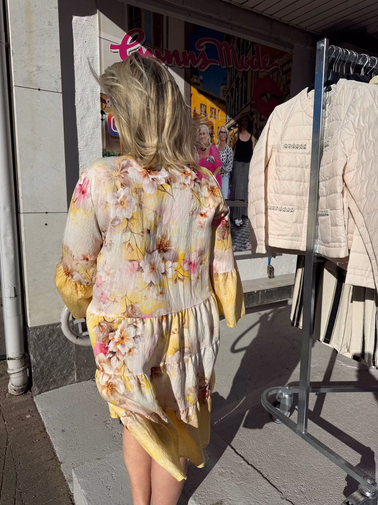 En romantisk och luftig klänning med ett elegant blommönster i varma, somriga nyanser. Tillverkad i ett lätt och följsamt material som ger en sval och bekväm känsla – perfekt för soliga dagar vid havet eller semesterns alla tillfällen.