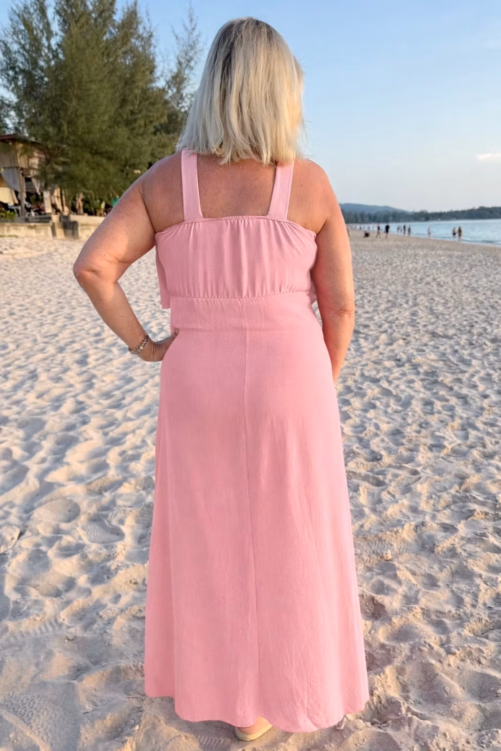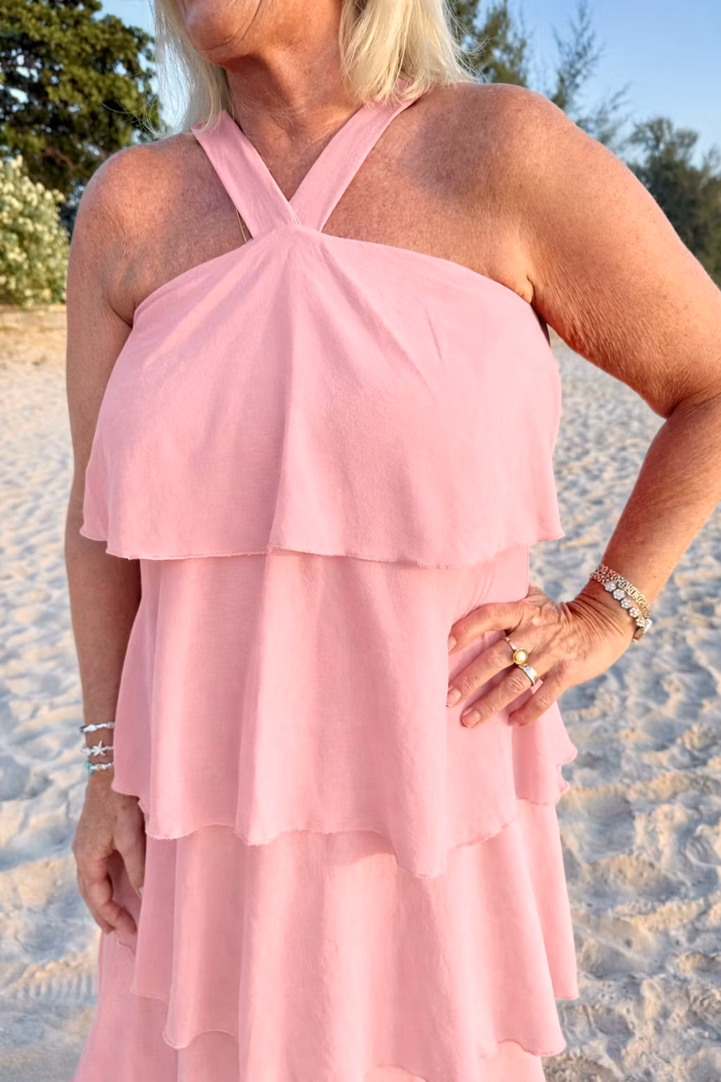 Elegant hellång rosa klänning med mjuka volanger som faller i lager längs kjolen. Smala axelband ger ett nätt intryck, medan resår i ryggen ger flexibel passform och komfort. En feminin och stilren klänning som passar perfekt till sommar, fest och semester.