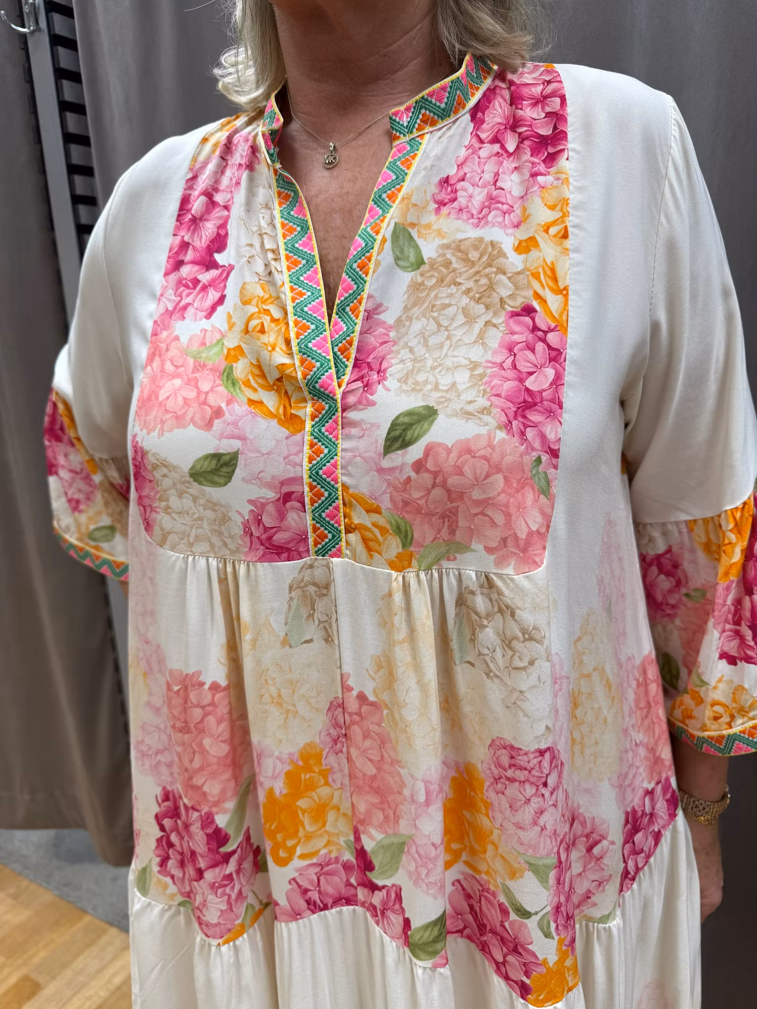 En feminin och luftig cremevit klänning med ett vackert blommönster i mjuka pastelltoner av orange, rosa och beige. Klänningen har en avslappnad passform och en elegant V-ringning med dekorativ kant som ger en färgstark och bohemisk känsla.