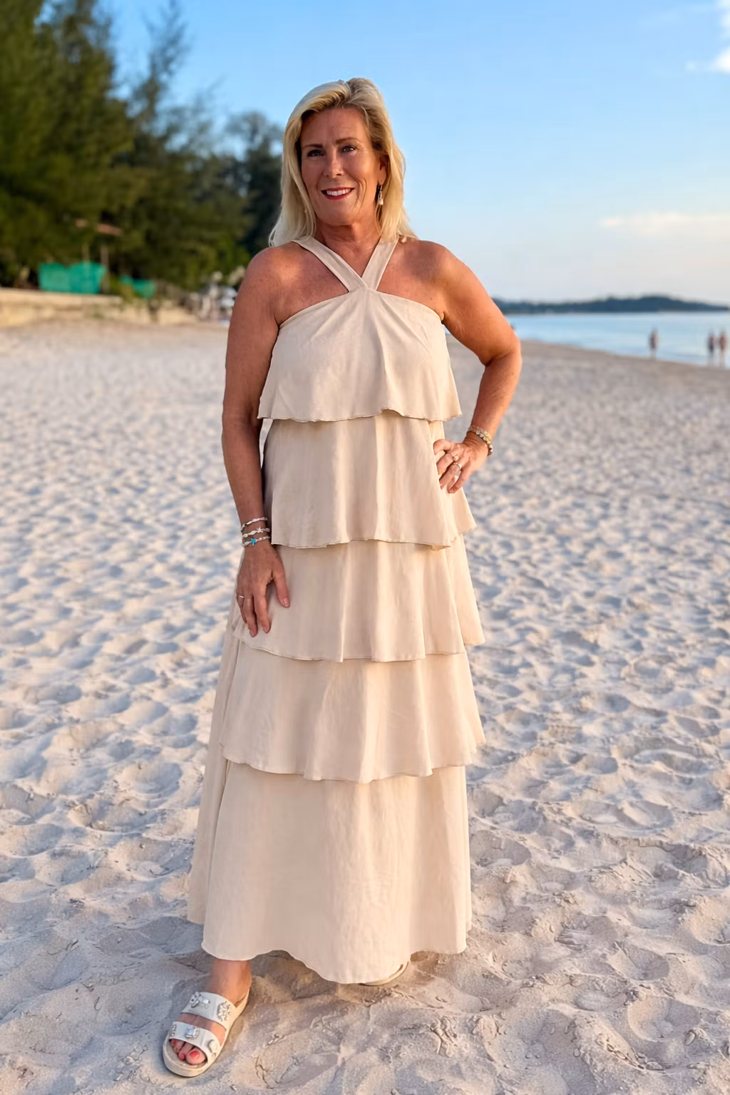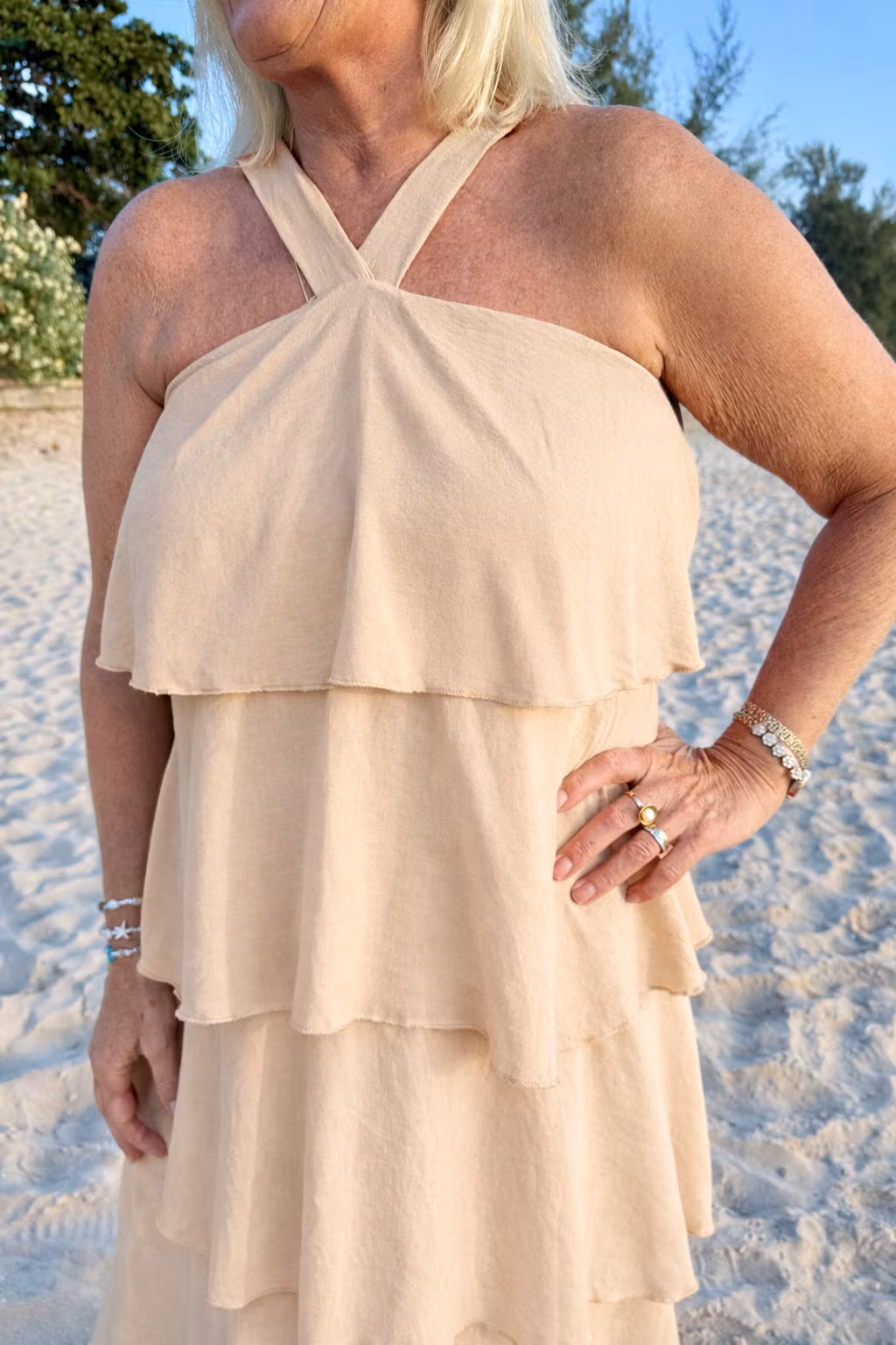 Elegant hellång beige klänning med mjuka volanger som faller i lager längs kjolen. Smala axelband ger ett nätt intryck, medan resår i ryggen ger flexibel passform och komfort. En feminin och stilren klänning som passar perfekt till sommar, fest och semester.