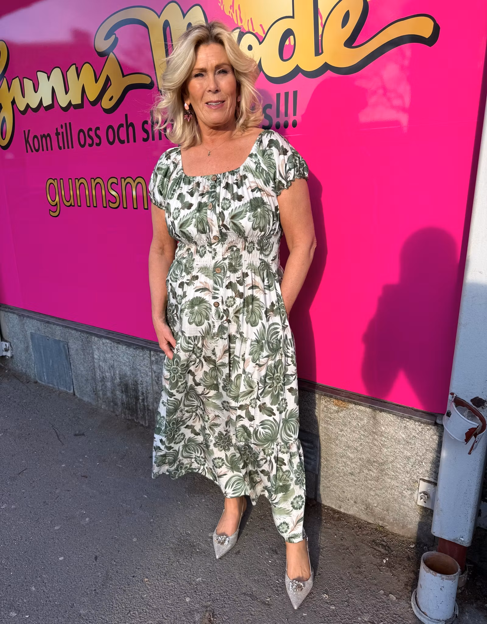 Romantisk och luftig maxiklänning i mjuk viskosmix med ett vackert blommönster. Klänningen har en smickrande smock i midjan som markerar figuren och ger en bekväm och flexibel passform.