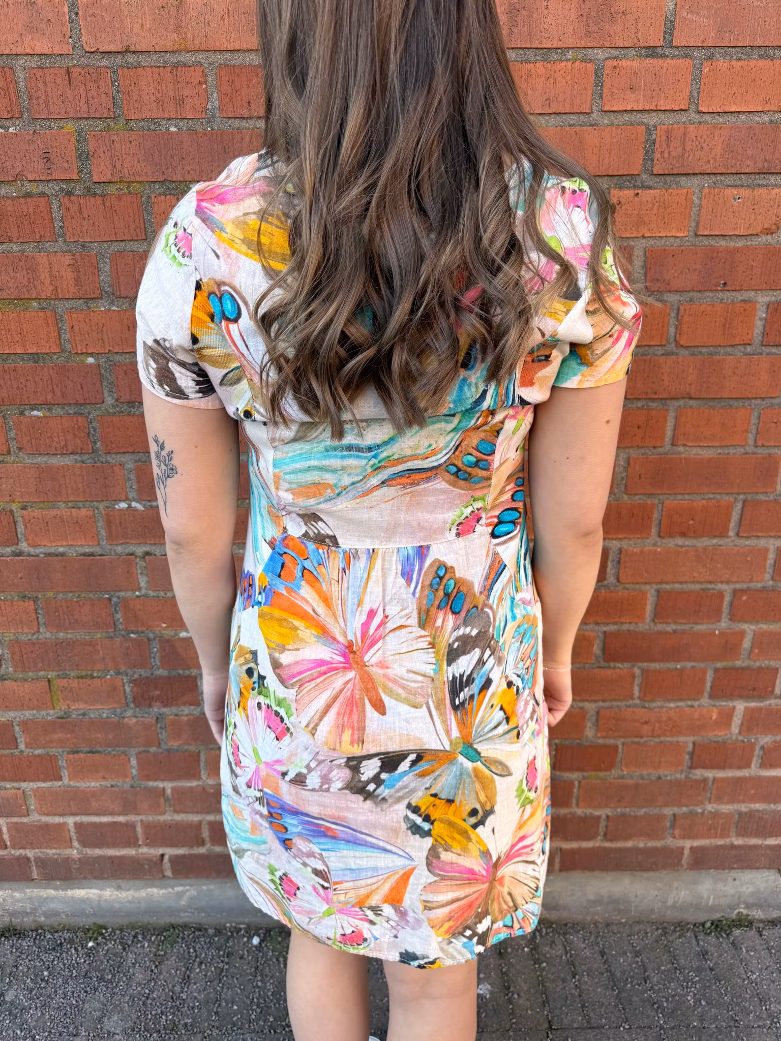 En färgstark och somrig klänning med ett vackert fjärilsmönster som verkligen drar blickarna till sig. De mjuka färgerna och det lekfulla mönstret ger klänningen ett livfullt och feminint uttryck.