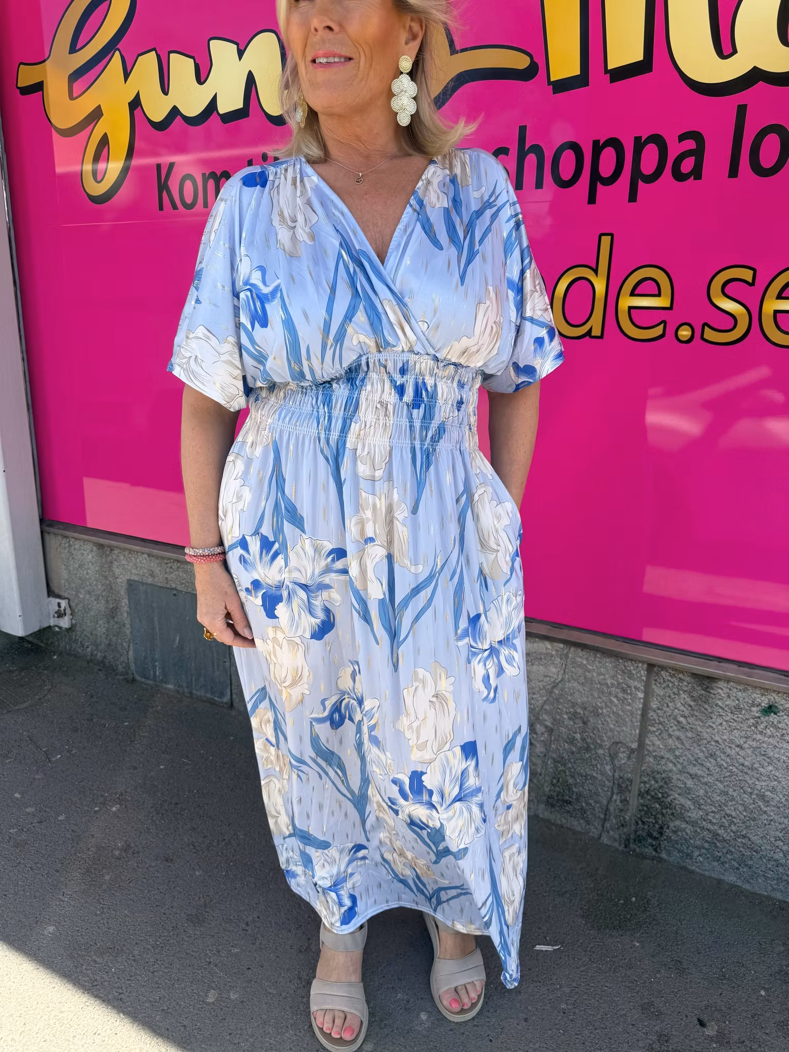 En luftig och stilfull maxiklänning med ett vackert blommönster där subtila gulddetaljer ger ett exklusivt och lyxigt intryck. Den smickrande omlottliknande överdelen tillsammans med den breda resåren i midjan framhäver figuren på ett elegant sätt.