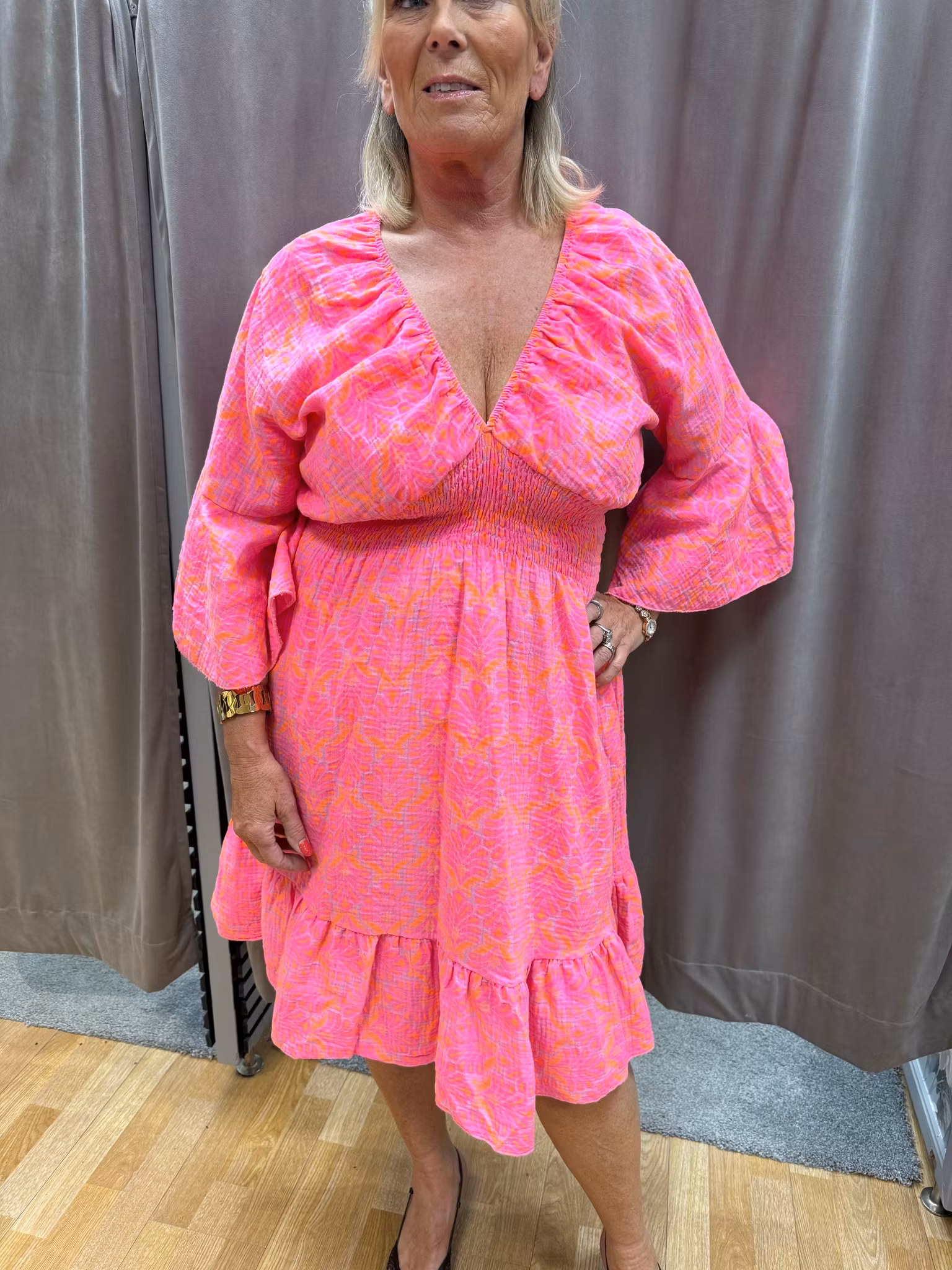 Magisk klänning med neonrosa print – färgstark och lekfull! Tillverkad i 100% bomull med krinklad, helt strykfri kvalitet som gör den lätt att bära och packa. Den breda smocken under bysten mot midjan ger en smickrande siluett, och resår vid halsringningen gör att du kan bära klänningen off-shoulder för en feminin och lekfull look.