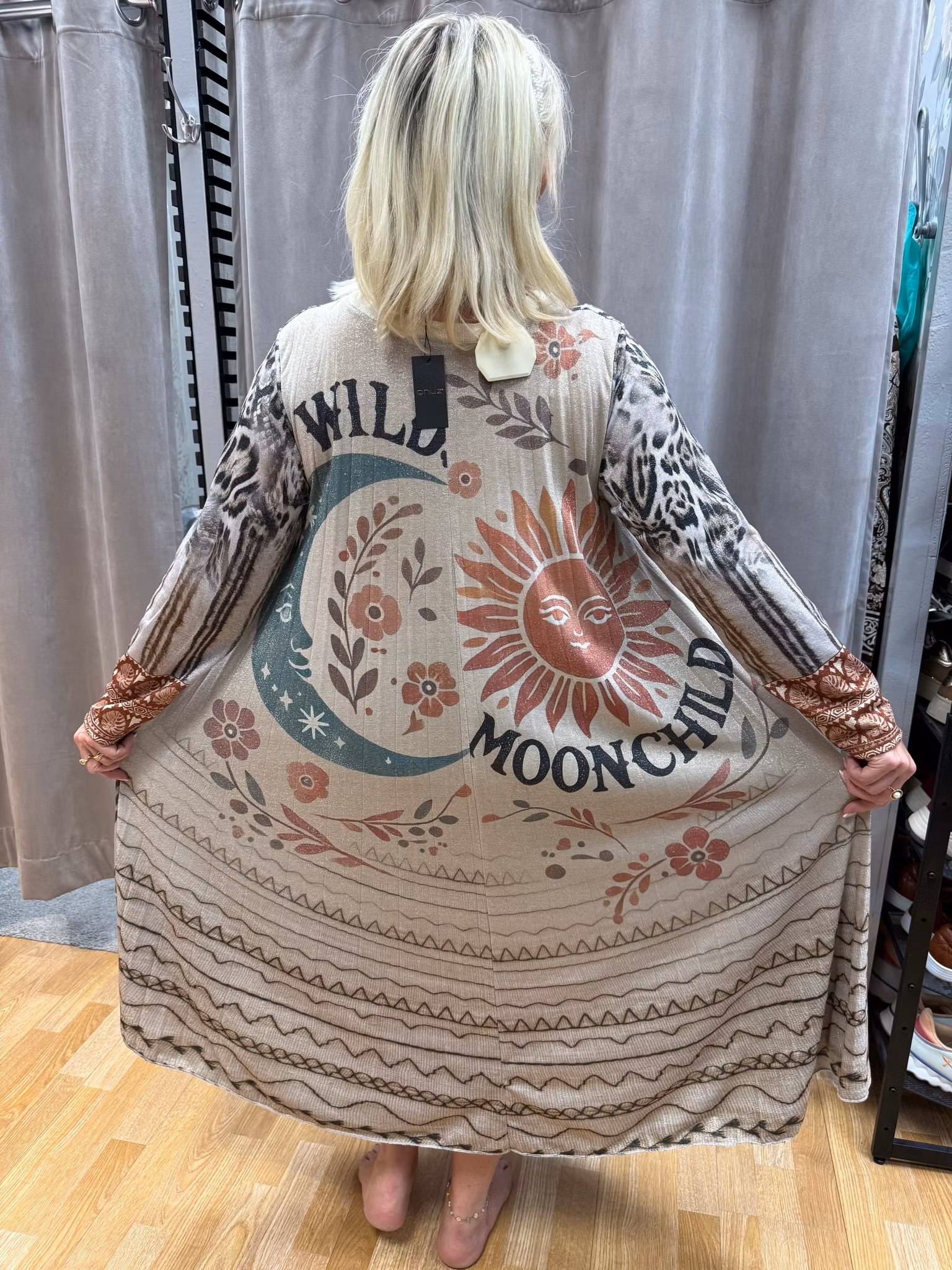 Gör ett starkt stiluttryck med denna unika One size midiklänning som kombinerar konstnärliga motiv, blommor och djurmönster. Klänningen är designad i en bohemisk stil med vackra färgkombinationer som gör den till ett riktigt statement-plagg.