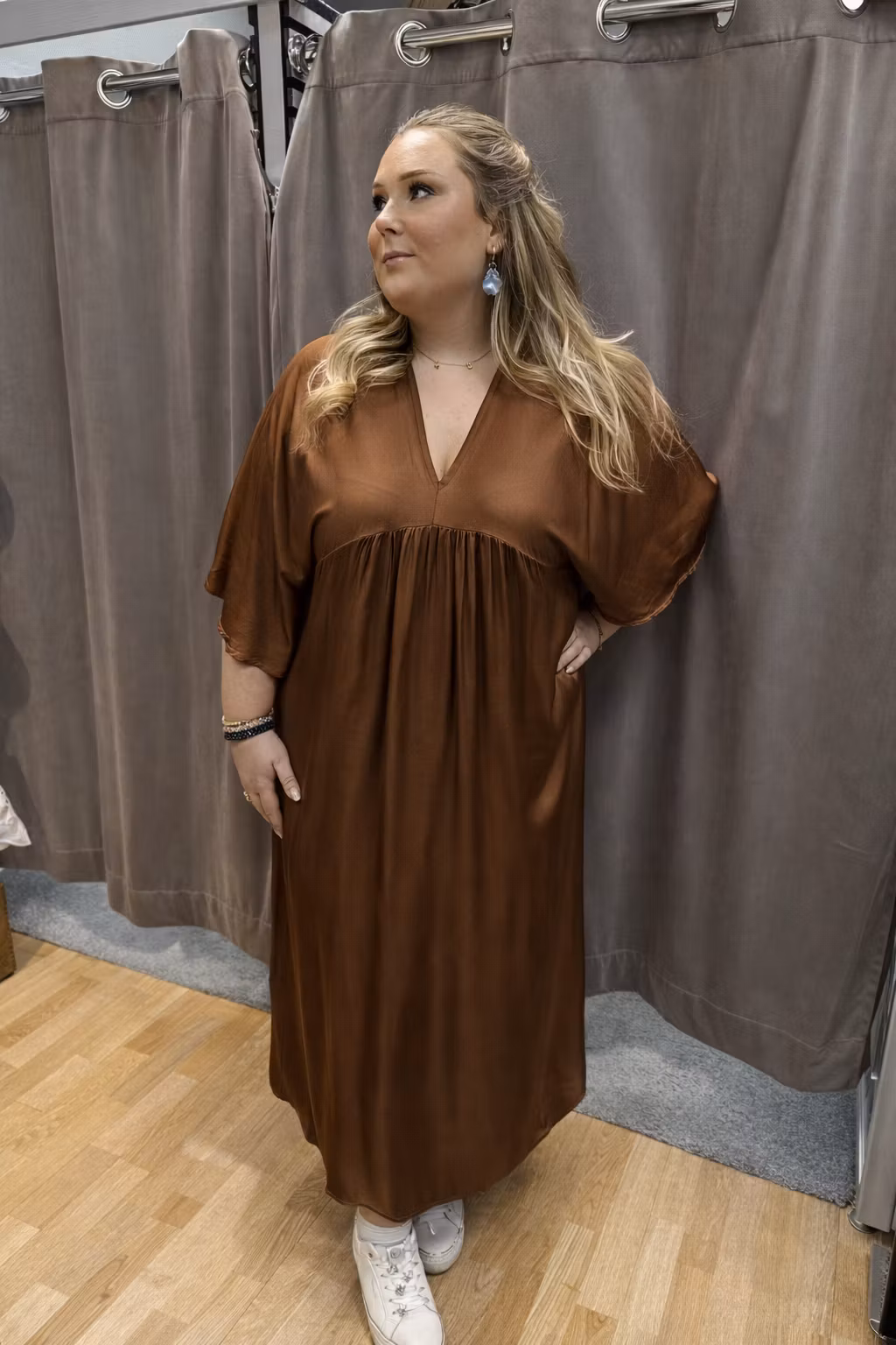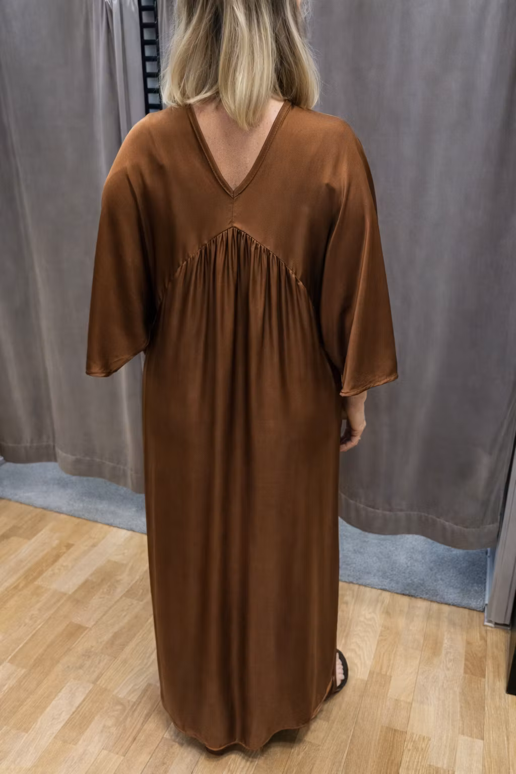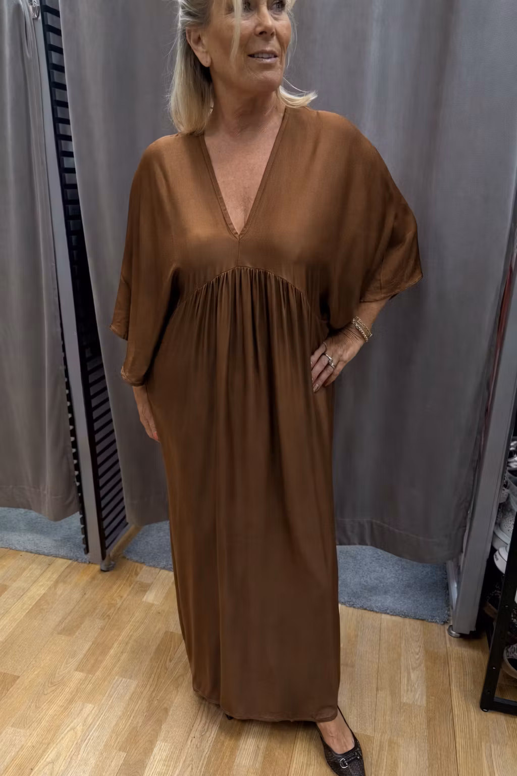 Fantastiskt fin klänning i brun viskos med elegant, satinliknande glans – en mjuk, feminin nyans som ger ett fräscht och exklusivt uttryck. Klänningen har en smickrande v-ringning och en vacker skärning som faller följsamt och framhäver siluetten på ett elegant sätt.