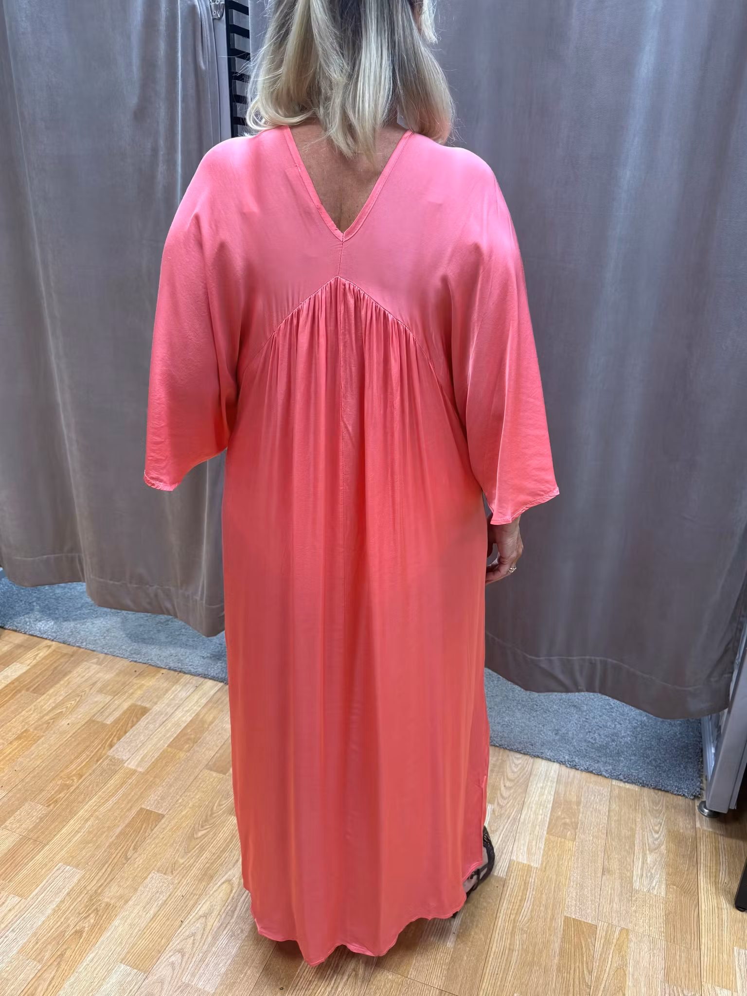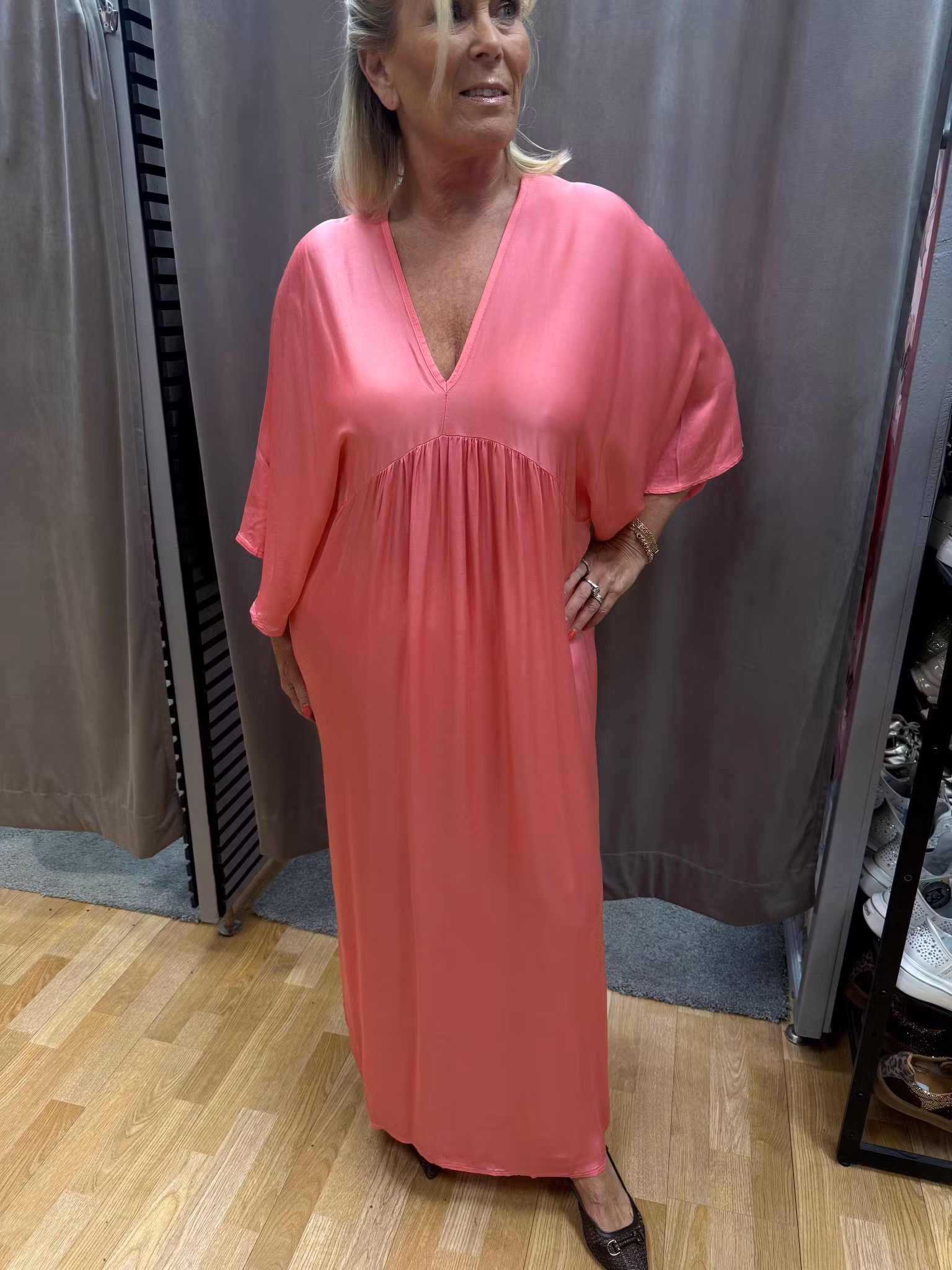Fantastiskt fin klänning i korallrosa viskos med elegant, satinliknande glans – en mjuk, feminin nyans som ger ett fräscht och exklusivt uttryck. Klänningen har en smickrande v-ringning och en vacker skärning som faller följsamt och framhäver siluetten på ett elegant sätt.