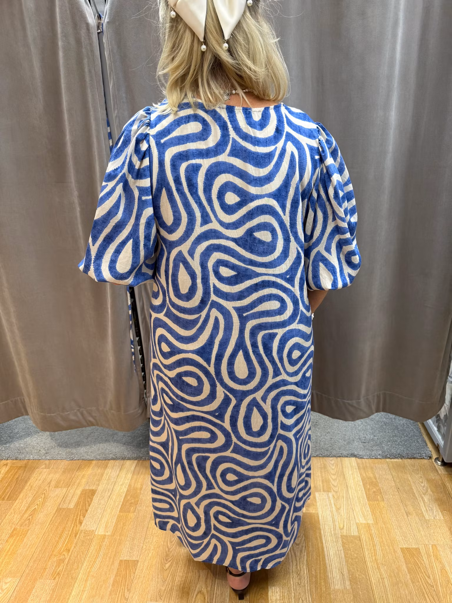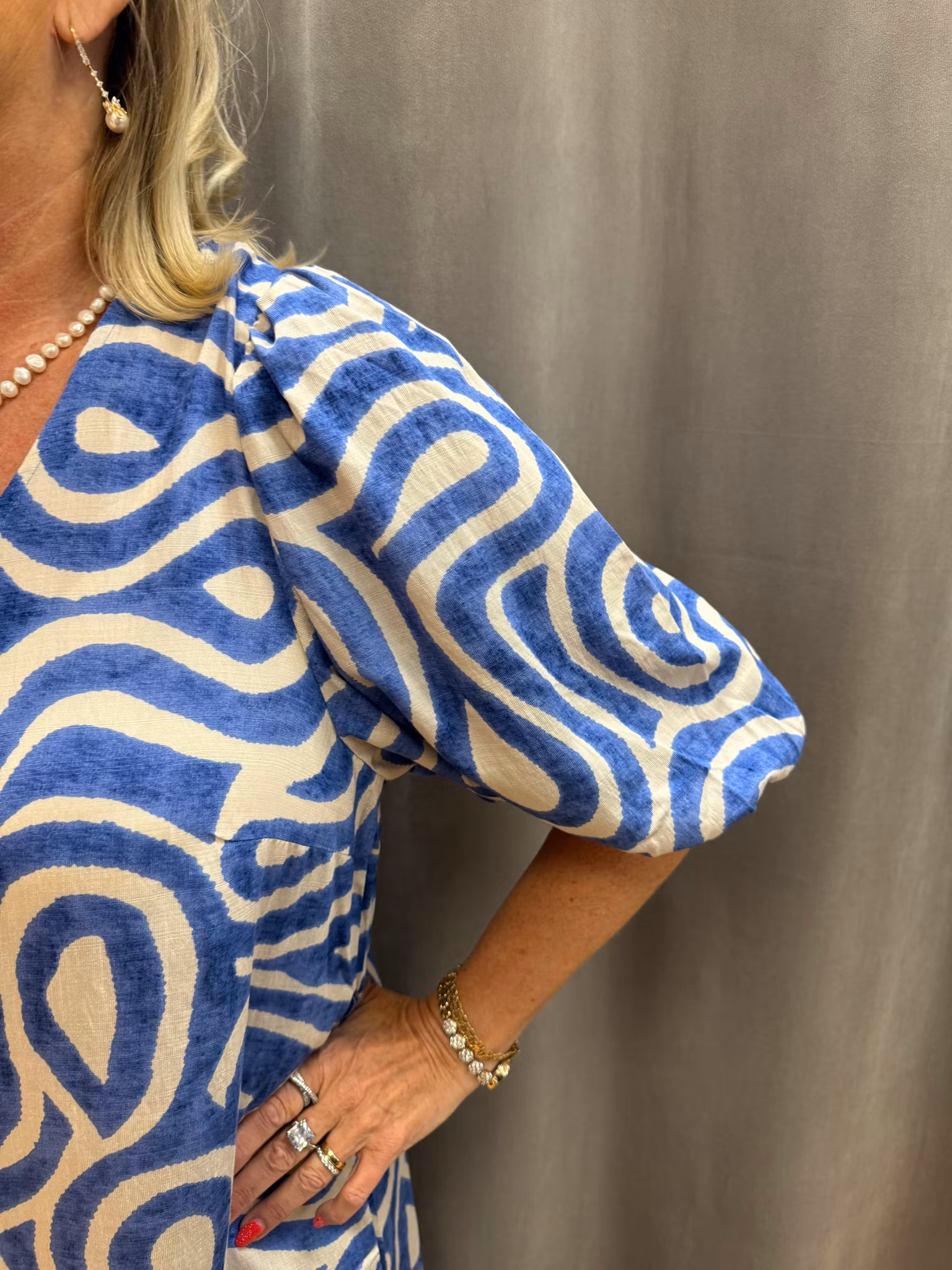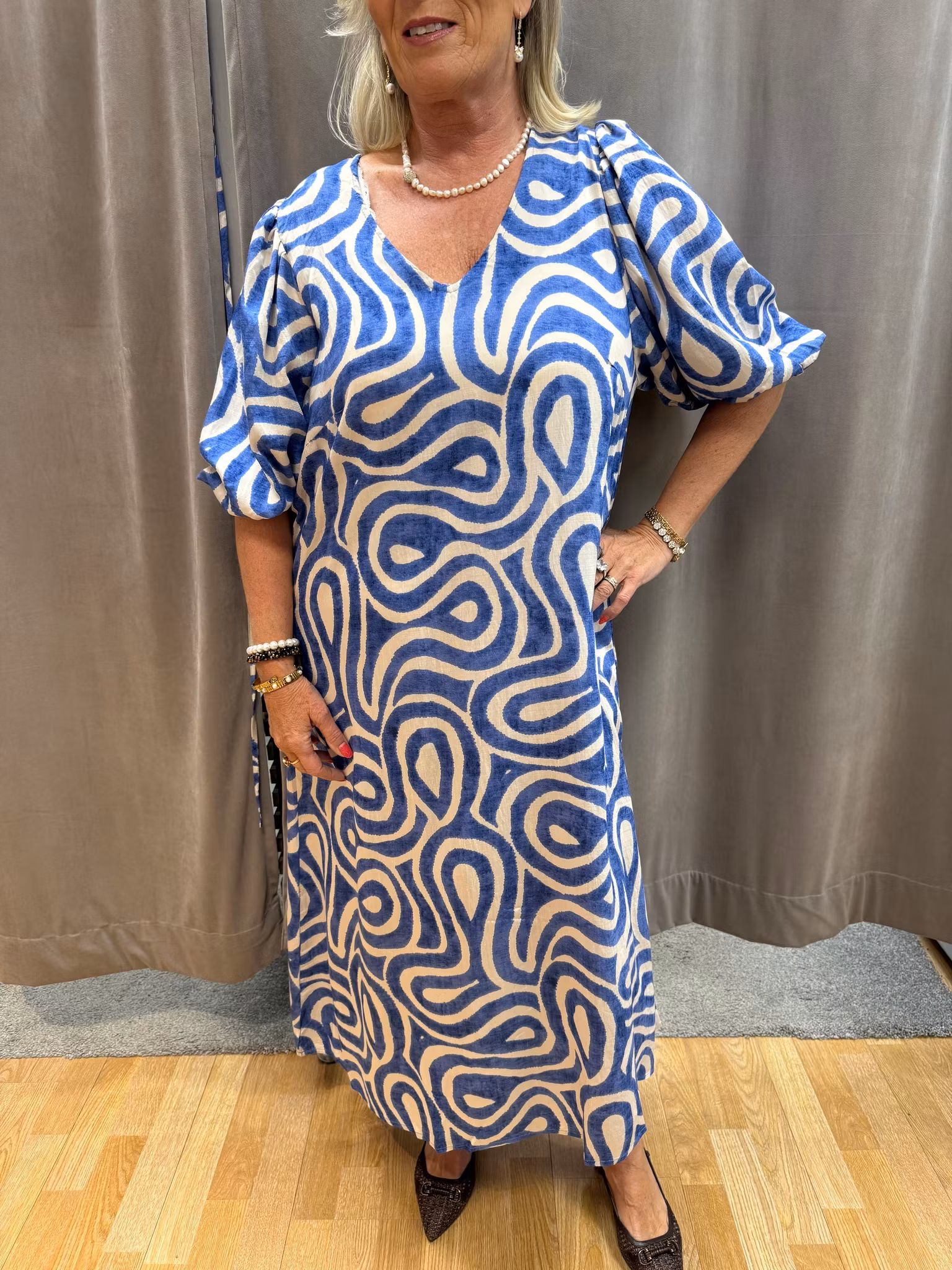 En elegant och feminin klänning i ett modernt, abstrakt mönster i blått och beige. Den har en smickrande V-ringning och dekorativa puffärmar som ger en stilfull och trendig silhuett. Den medföljande knytningen i midjan markerar figuren och gör att du enkelt kan anpassa passformen efter önskad look. Klänningen är rymlig i storleken.