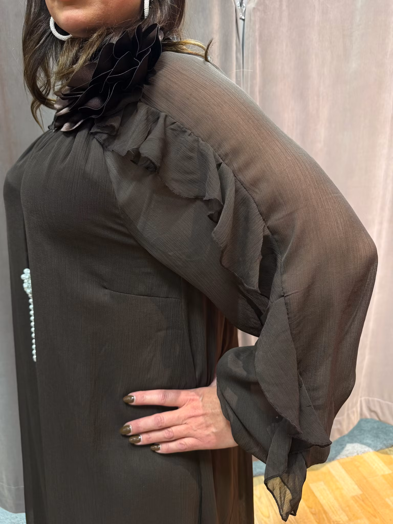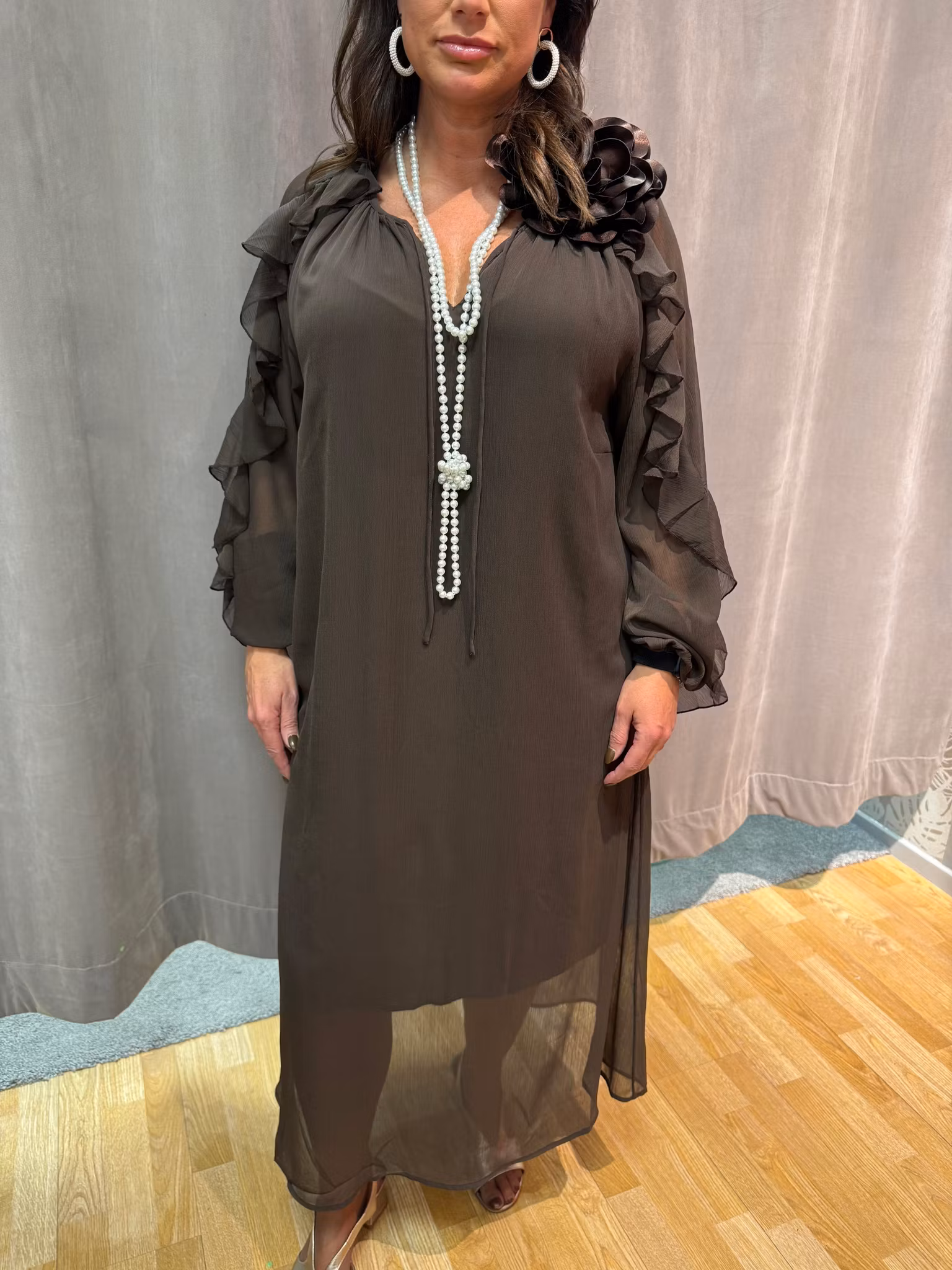 Denna bruna chiffongklänning utstrålar klass, elegans och feminin stil. Klänningen är tillverkad i ett lätt och luftigt chiffongtyg som ger ett vackert fall och en mjuk siluett. De romantiska volangärmarna och den v-ringade halsringningen skapar en sofistikerad look med en exklusiv känsla.