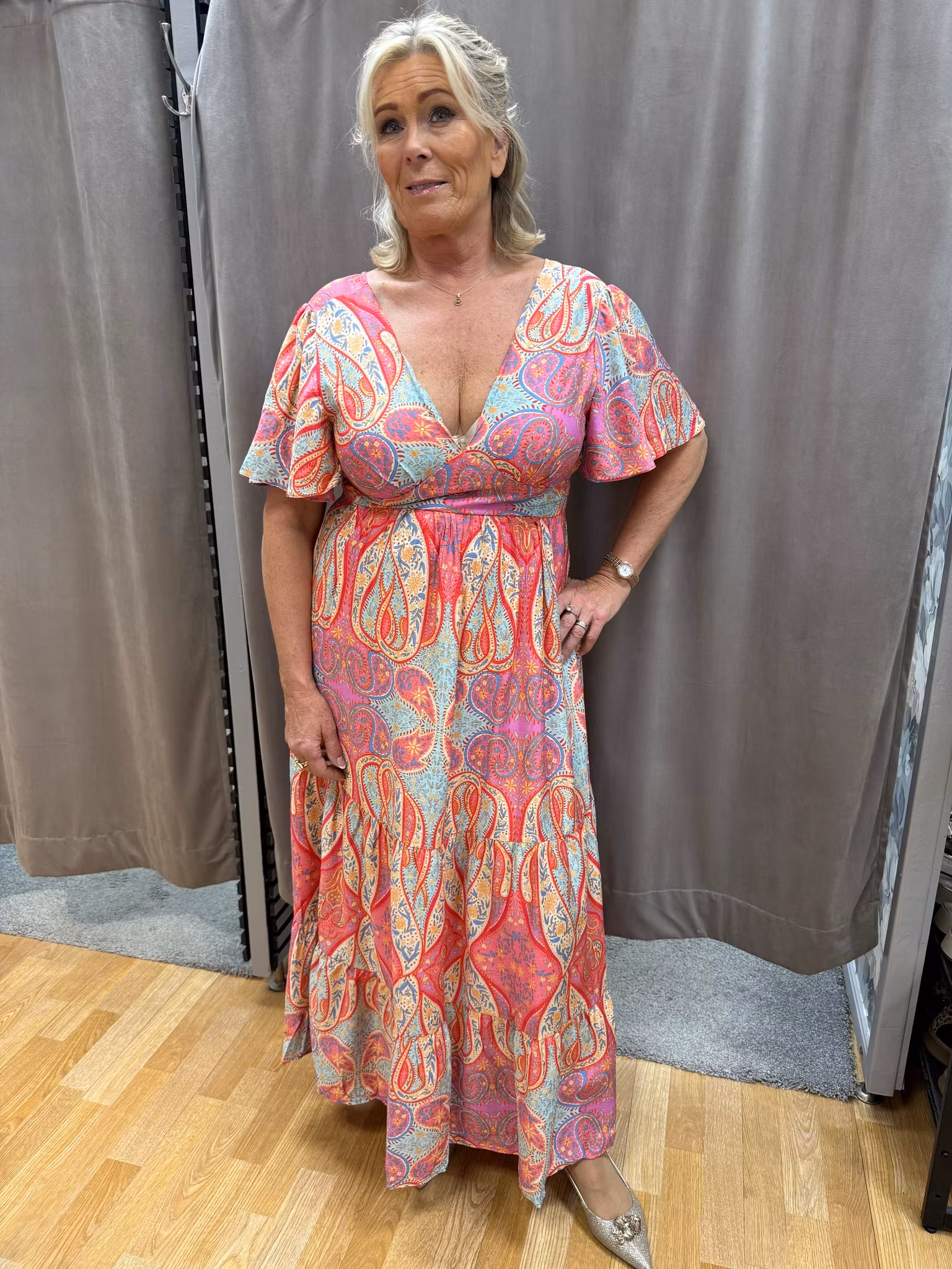 En vacker och feminin maxiklänning i ett färgstarkt paisleymönster som ger en härlig sommarkänsla. Klänningen har en smickrande V-ringning och en markerad midja som skapar en elegant siluett. De korta, lätt utsvängda ärmarna ger ett mjukt och luftigt fall.