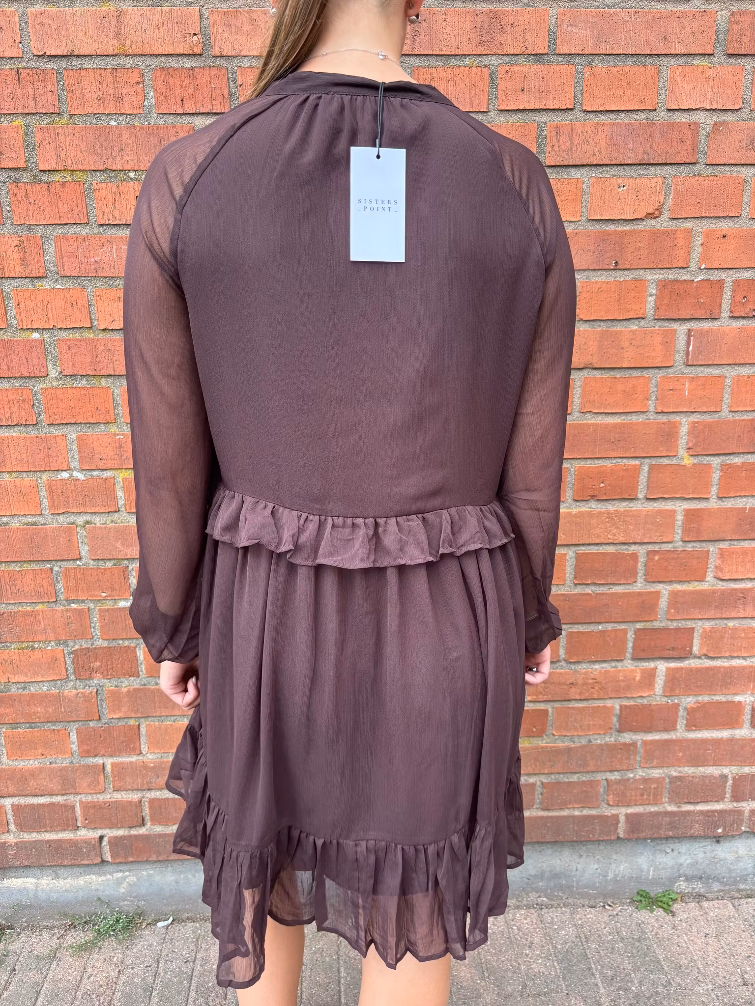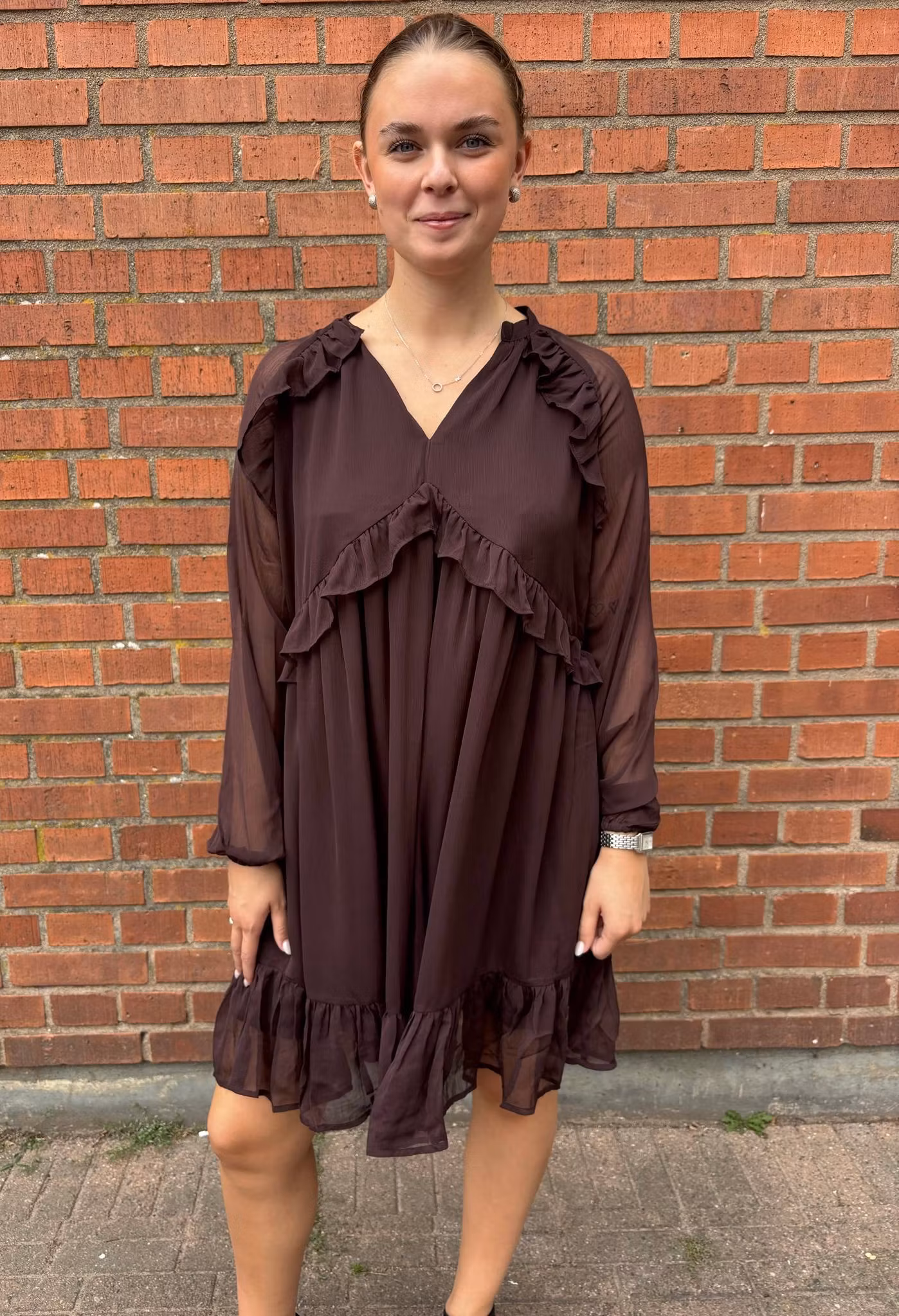 Stilren rödbrun klänning i lätt och luftigt material. Klänningen har v-ringning, långa transparenta ärmar och dekorativa volanger som ger en feminin touch. Den lediga passformen gör den både bekväm och snygg – perfekt till vardag, fest eller middagsbjudning.