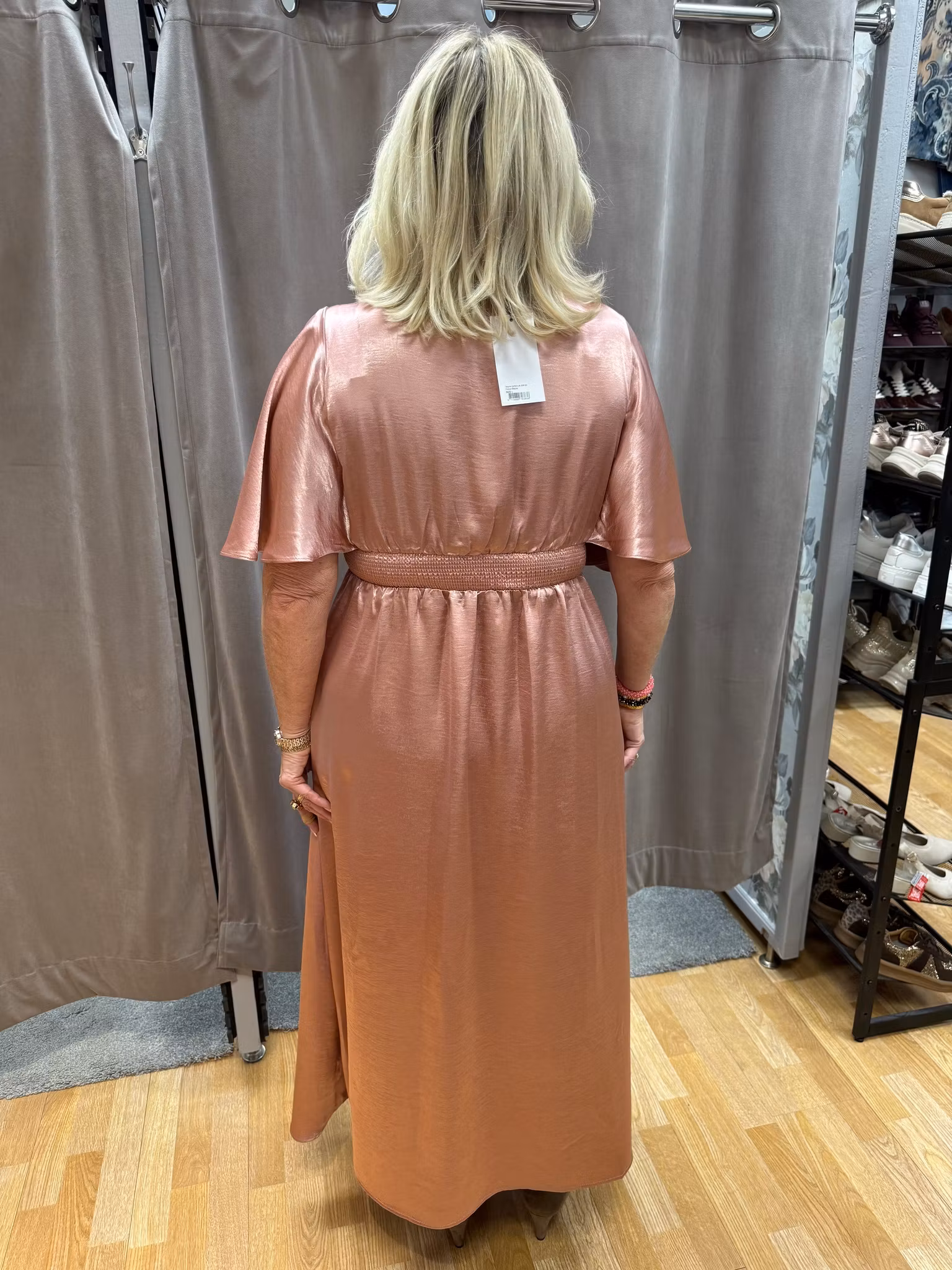 Elegant långklänning i ett lätt och följsamt material som ger ett vackert fall och en bekväm känsla hela dagen. Klänningen har en smickrande V-ringning och en markerad midja som framhäver silhuetten på ett mjukt och feminint sätt. De vida, korta ärmarna faller ledigt över axlarna och skapar ett luftigt uttryck som passar perfekt under vår och sommar, men fungerar lika bra att bära året runt med rätt styling.