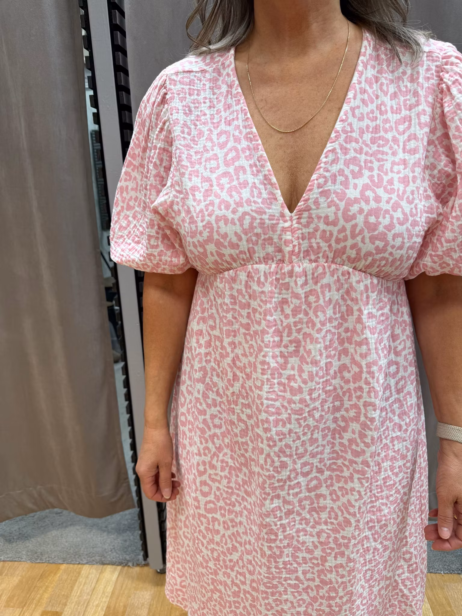 En feminin och trendig Onesize midiklänning i ljusrosa leopardmönster som kombinerar komfort med stil. Klänningen har en smickrande, lätt A-linjeformad silhuett med markerad midja som framhäver figuren på ett elegant sätt. Den djupa V-ringningen framtill ger ett luftigt intryck, medan den öppna ryggen med knytband baktill skapar en fin och iögonfallande detalj.