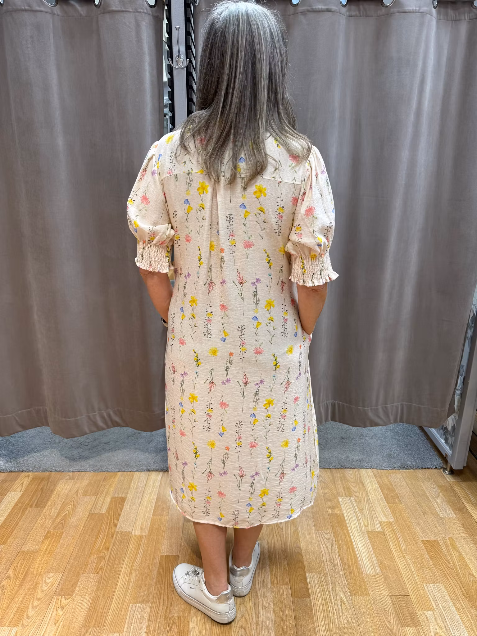 De korta puffärmarna med resår vid ärmsluten ger en fin volym och en bekväm passform, samtidigt som de bidrar till ett romantiskt och modernt uttryck. Det mjuka, lätta tyget faller fint längs kroppen och gör klänningen perfekt för varmare dagar. Midilängden gör den både mångsidig och stilren.