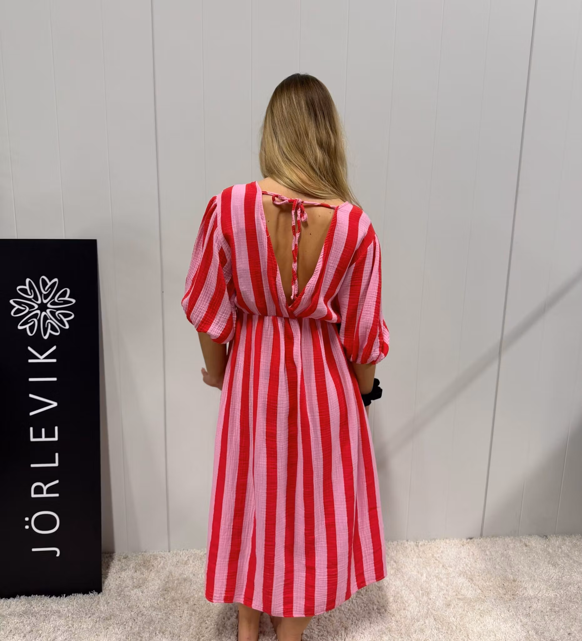En feminin och luftig klänning i mjukt, lätt strukturerat tyg som ger en avslappnad men elegant känsla. Klänningen har ett smickrande V-ringad liv med markerad midja som faller ut i en ledig, knälång kjol. De breda ränderna i rött och rosa skapar ett lekfullt och somrigt uttryck.