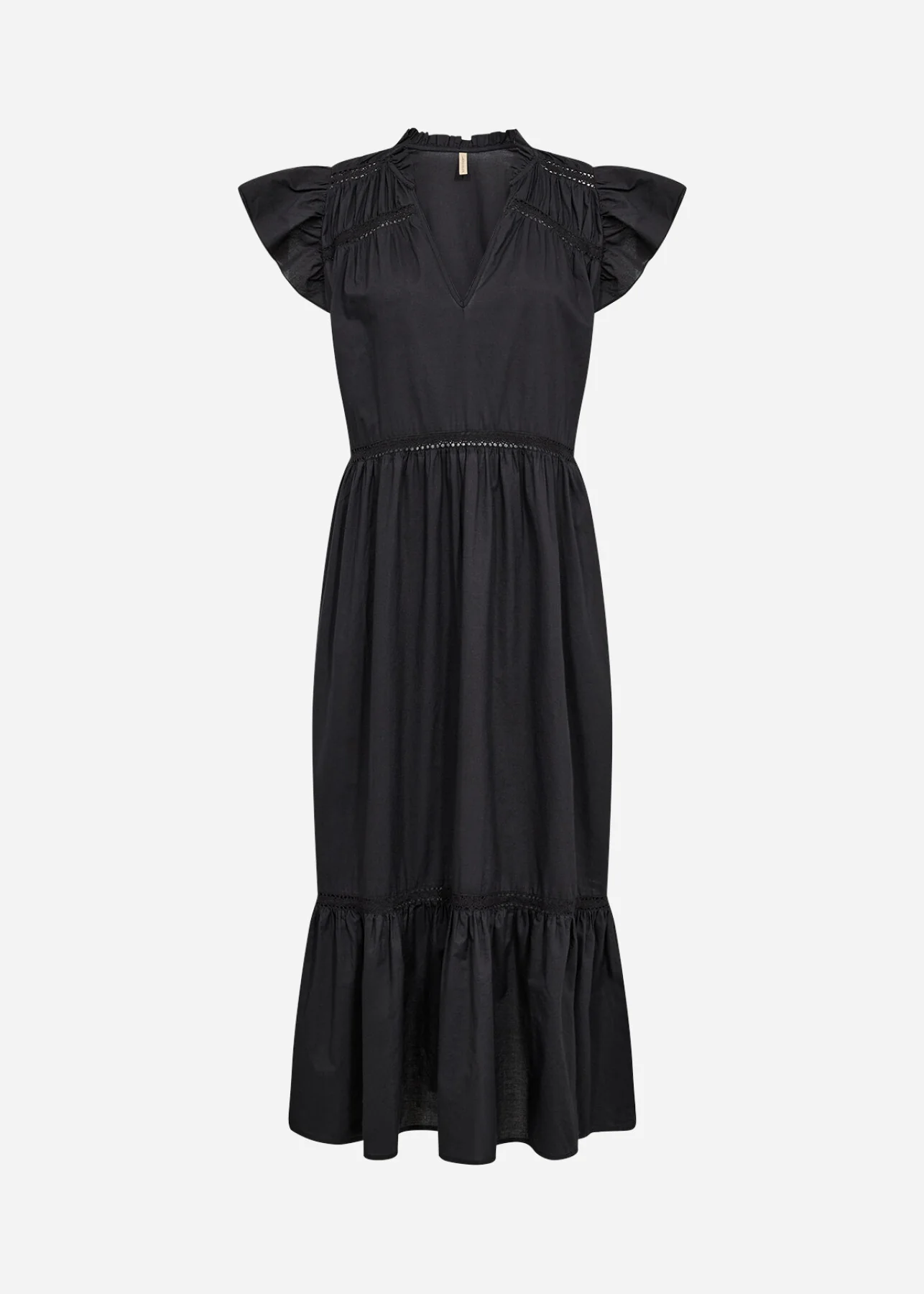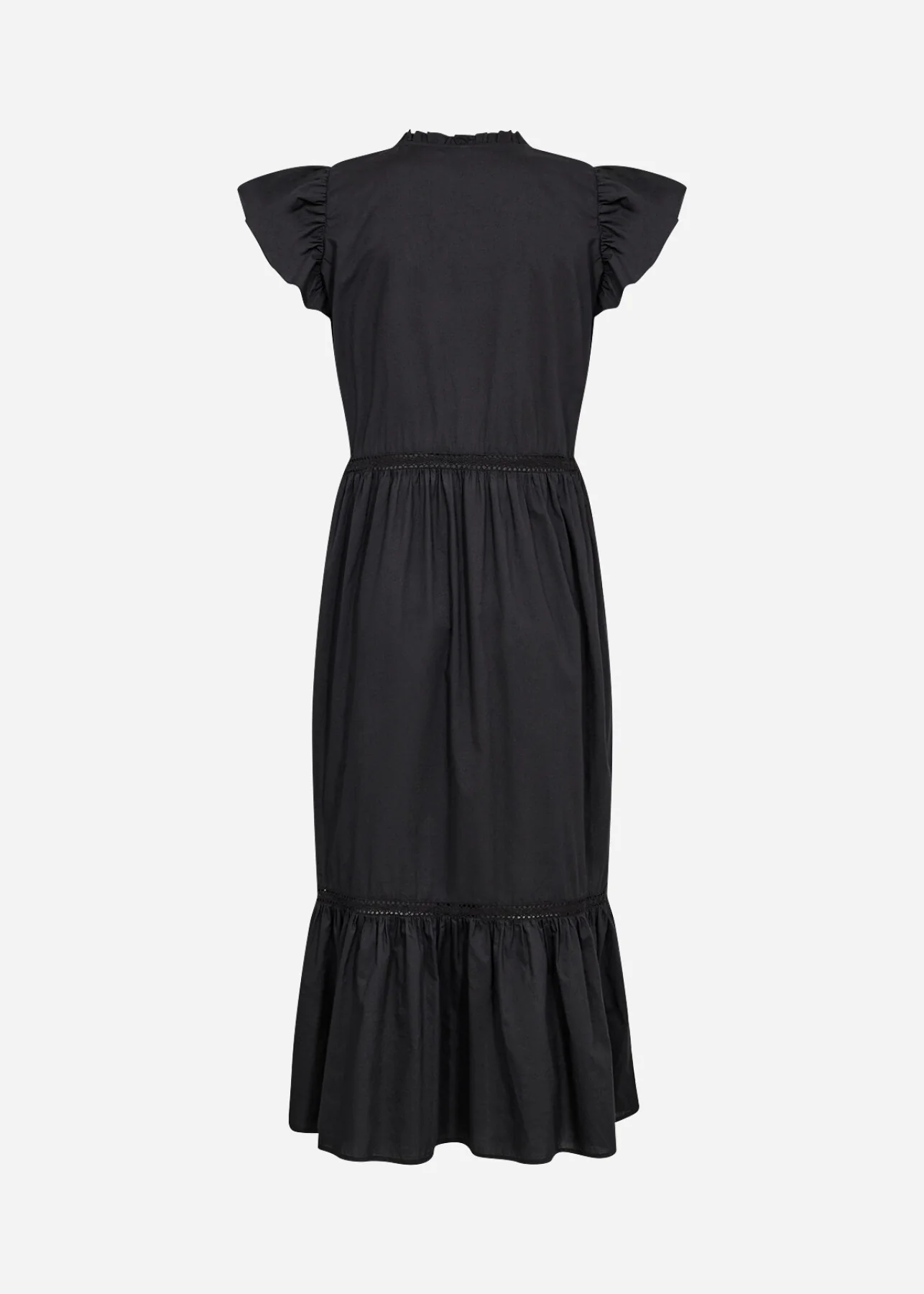klänning tillverkad av 100% ekologisk bomull. Klänningen har en V-ringning, fina spetsdetaljer och en volangkant för en elegant look. Kombinera den med enkla accessoarer för en cool och snygg outfit.