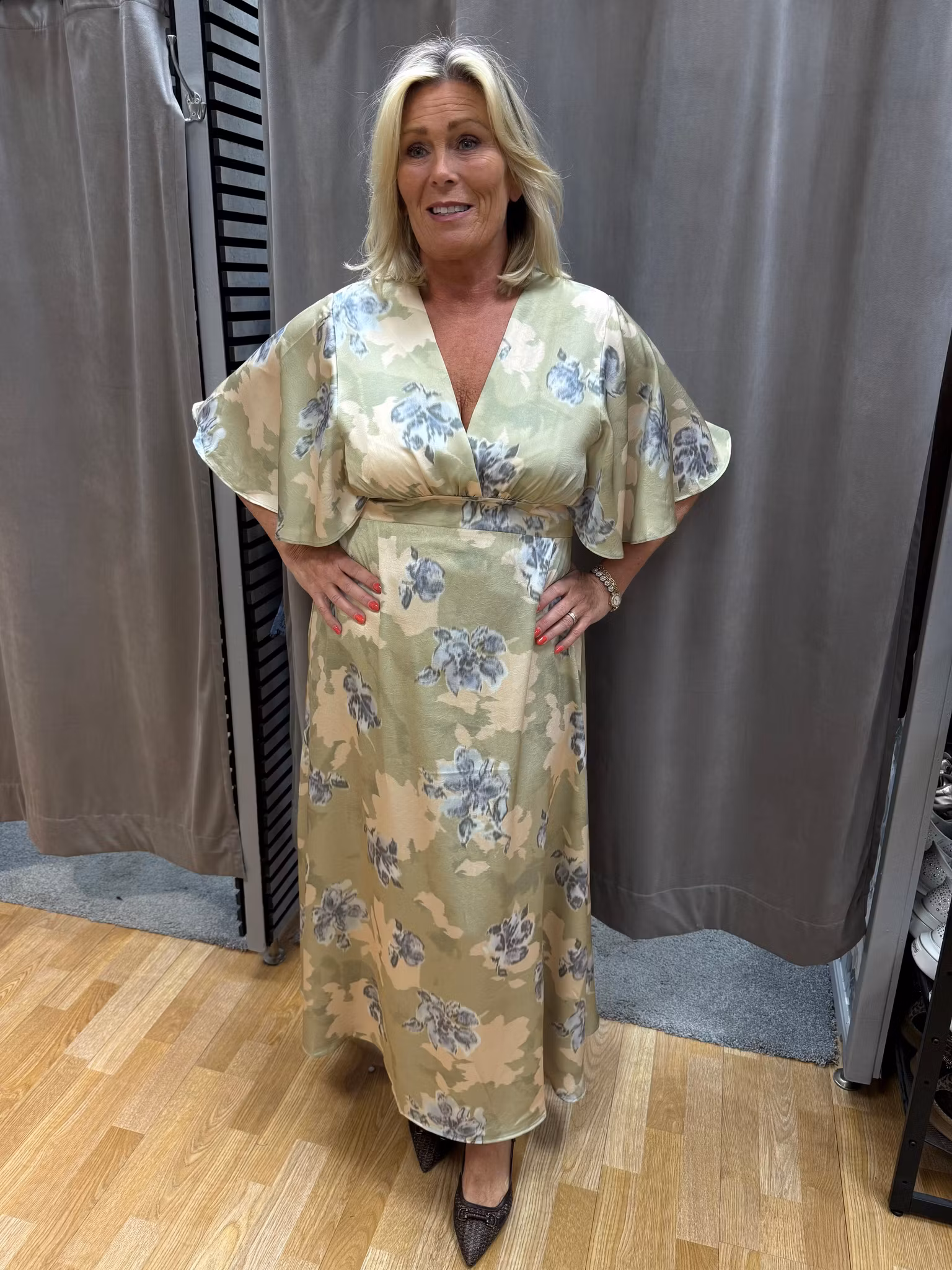 Elegant långklänning i ett lätt och följsamt material som ger ett vackert fall och en bekväm känsla hela dagen. Klänningen har en smickrande V-ringning och en markerad midja som framhäver silhuetten på ett mjukt och feminint sätt. De vida, korta ärmarna faller ledigt över axlarna och skapar ett luftigt uttryck som passar perfekt under vår och sommar, men fungerar lika bra att bära året runt med rätt styling.