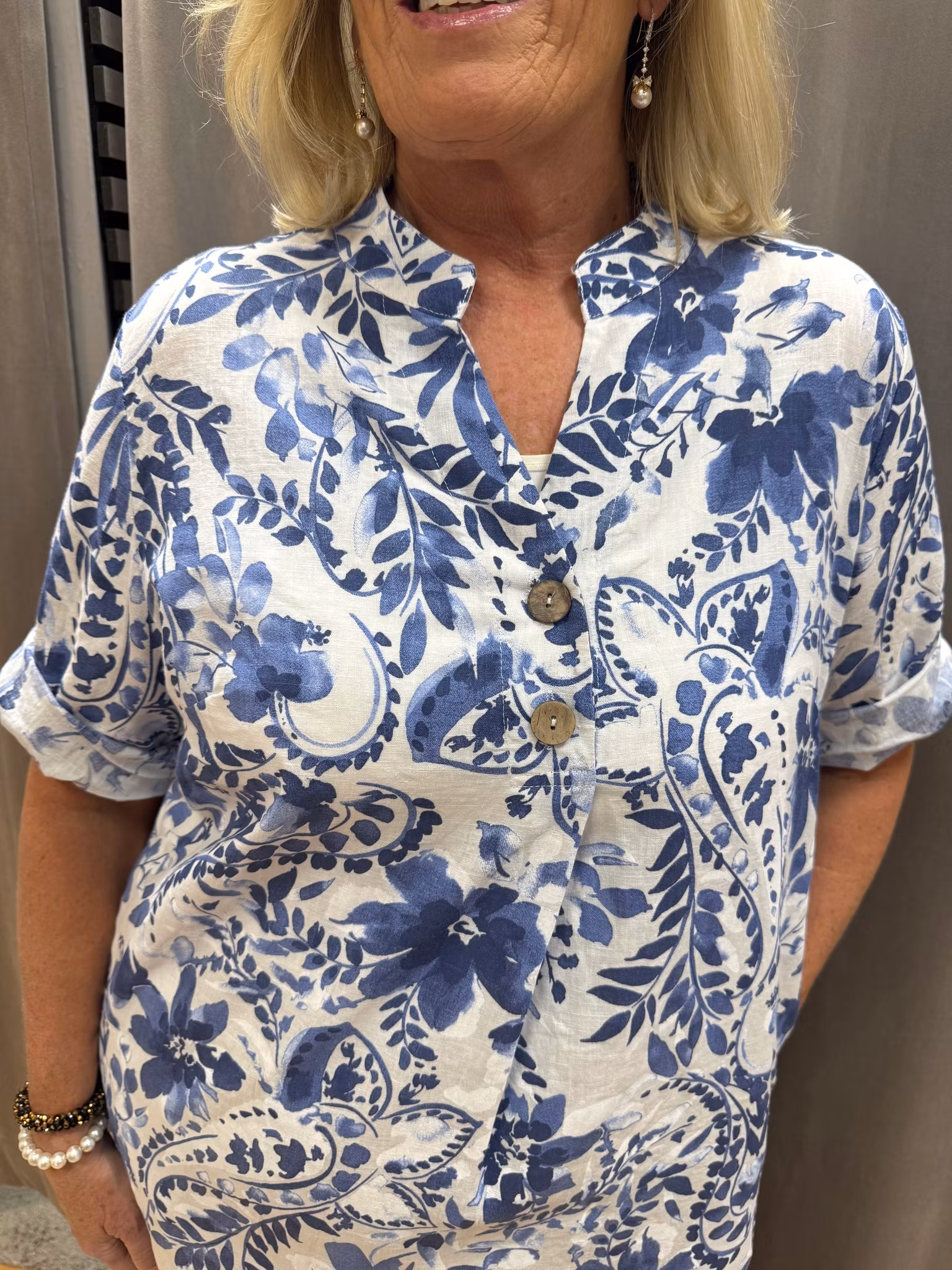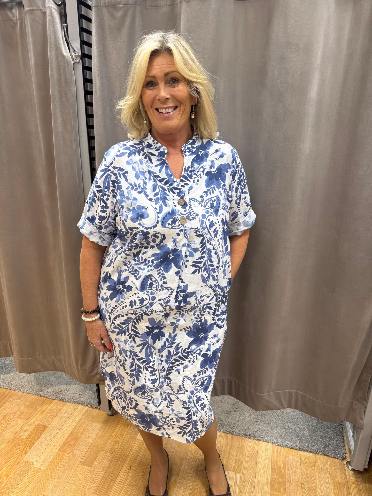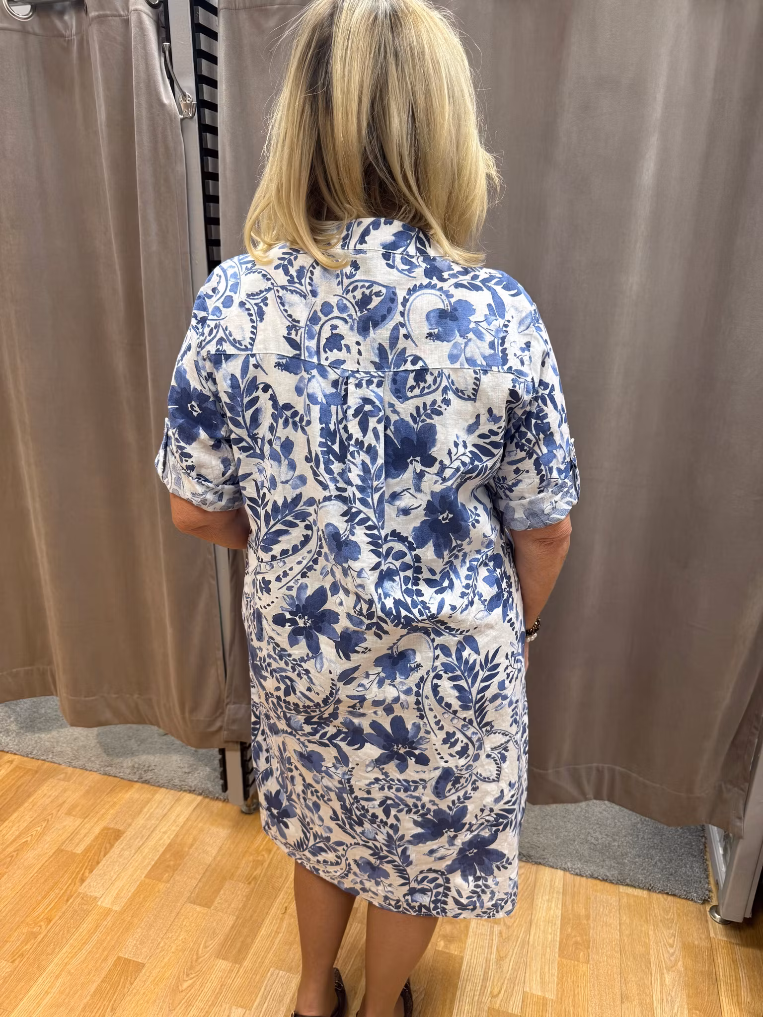 En stilren och lättburen klänning med vackert blått blommönster som ger ett fräscht och somrigt intryck. Den raka modellen faller mjukt och bekvämt längs kroppen och ger en avslappnad men ändå elegant silhuett.