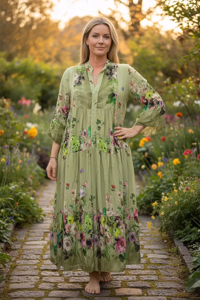 Det dekorativa blommönstret tillför liv och karaktär, vilket gör klänningen perfekt för både vardag och mer uppklädda tillfällen. Den längre längden ger ett sofistikerat uttryck och gör den enkel att styla med både sandaler och stövlar beroende på säsong.