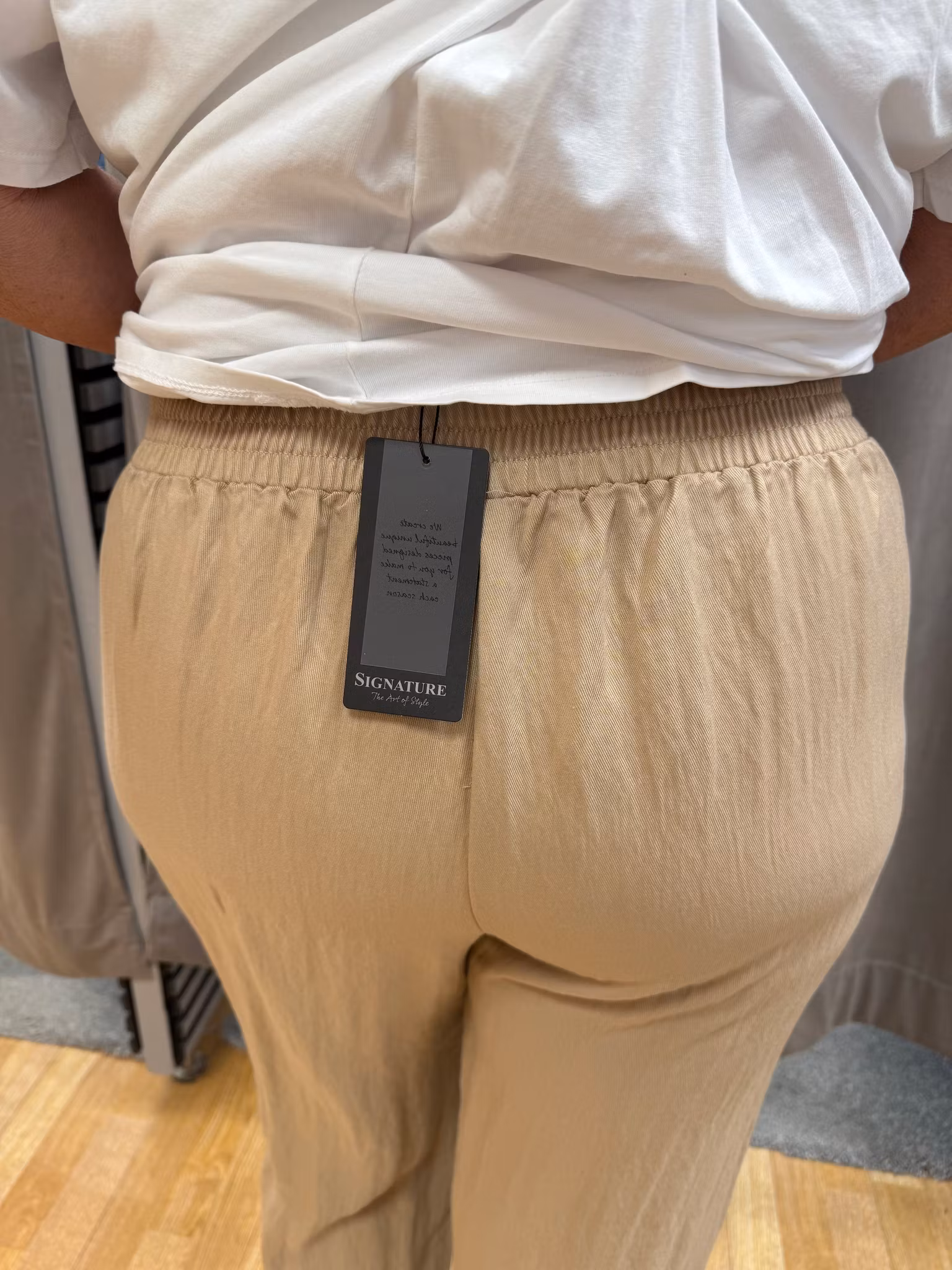 Eleganta och bekväma beige byxor i mjukt Tencel-material som ger ett lyxigt, följsamt fall och hög komfort. Tencel är ett andningsbart och hudvänligt material som känns svalt mot huden och gör byxorna perfekta att bära hela dagen.