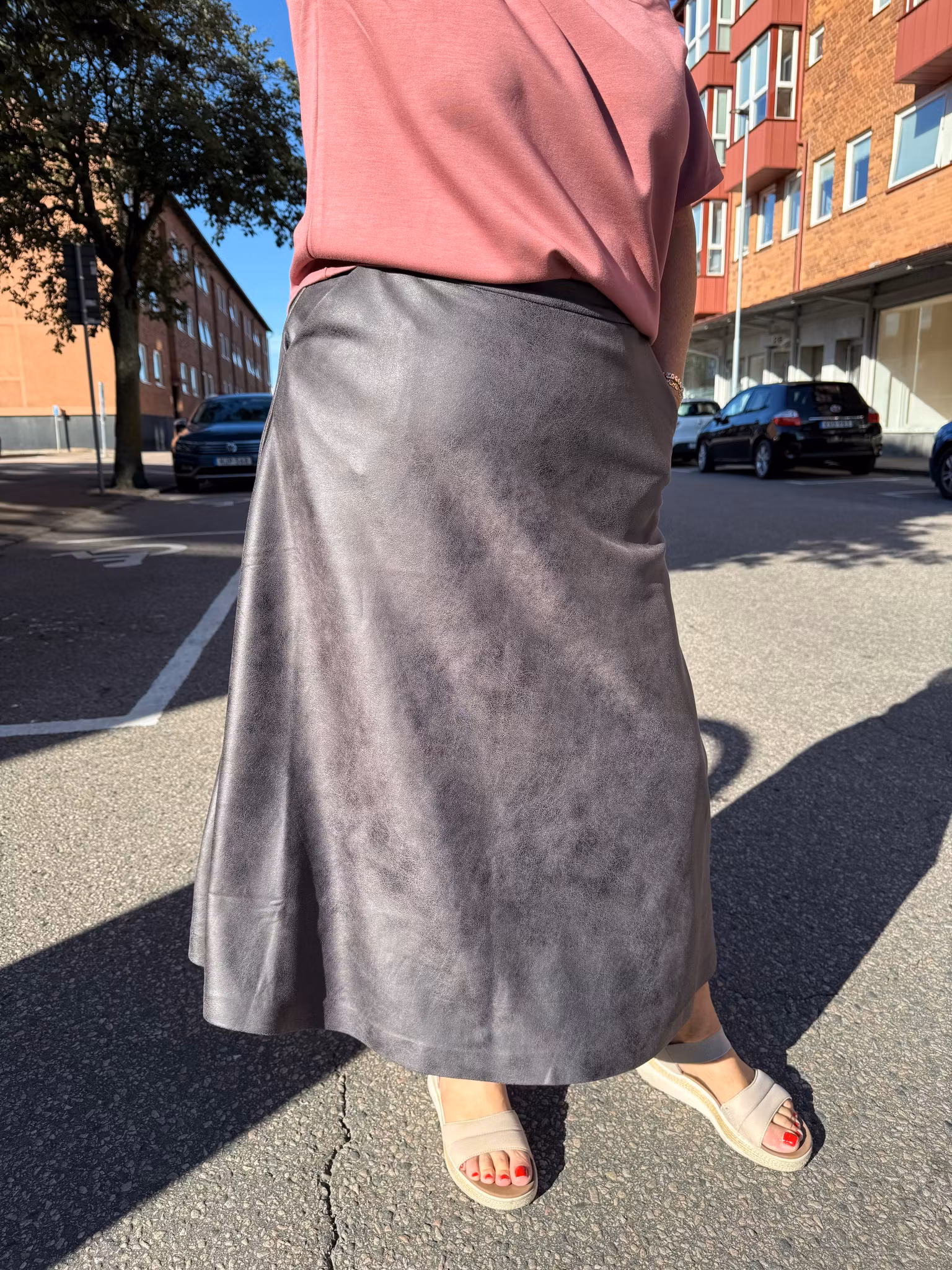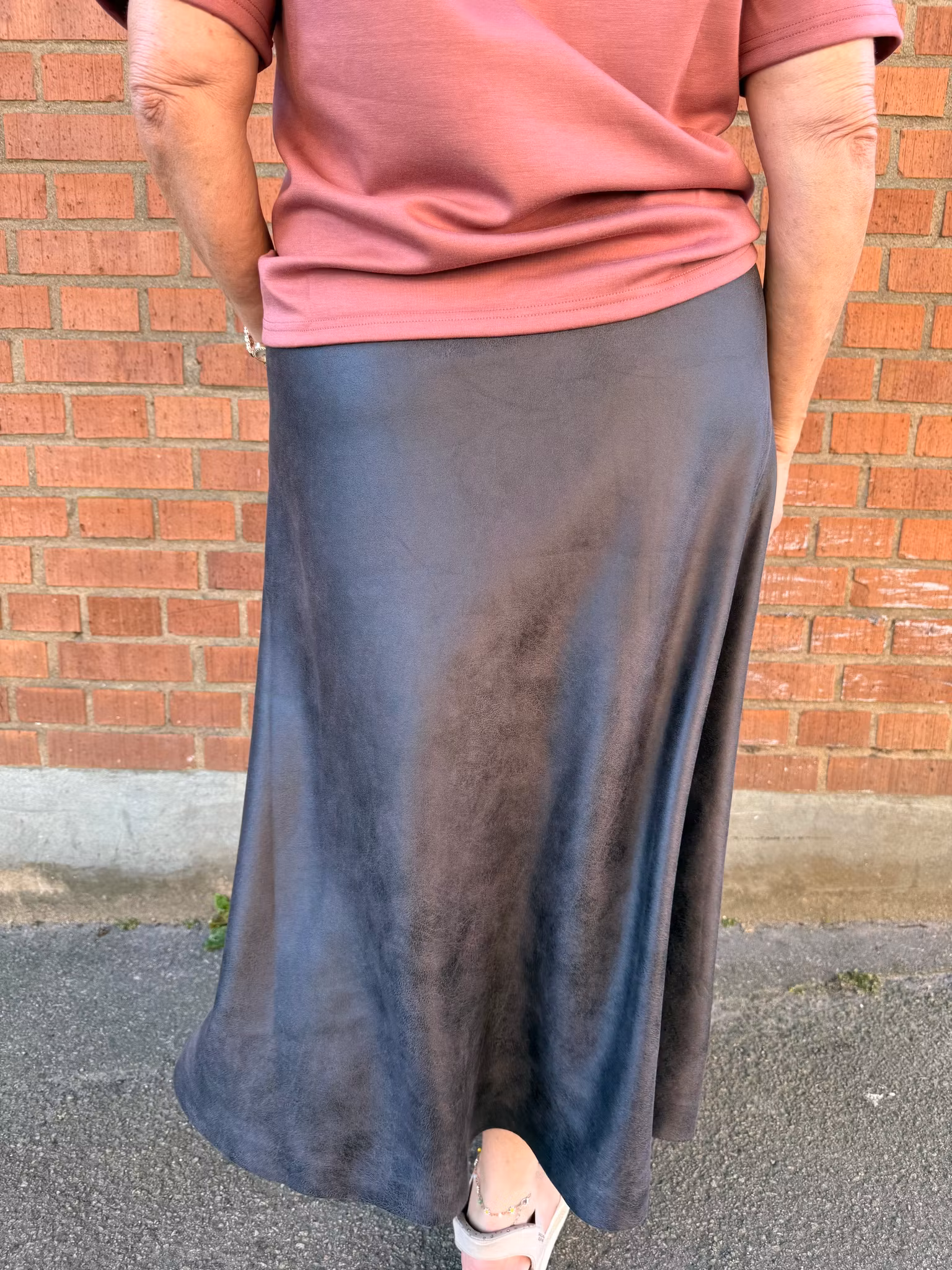 Stilren brun/grå kjol i skinnliknande material. Den har ett mjukt fall och ett lätt utställt snitt som ger en feminin siluett. Kjolen är vadlång och passar perfekt både till vardags och fest – enkel att matcha med blus, stickad tröja eller en t-shirt för en mer avslappnad look
