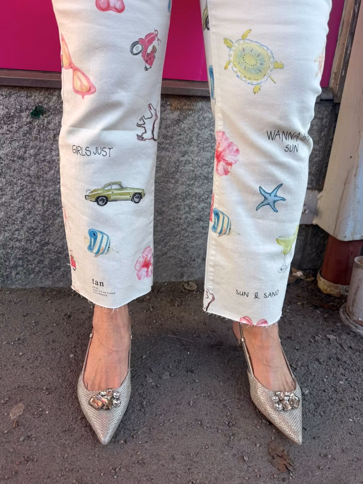 Stick ut i mängden med dessa stilfulla jeans med cremefärgad botten, dekorerade med lekfulla, somriga motiv. Byxorna har ett modernt rakt snitt med något kortare benlängd som ger en fräsch och trendig look. De färgglada trycken – med allt från blommor och snäckor till cocktails och grafiska illustrationer – skapar en unik och personlig stil.