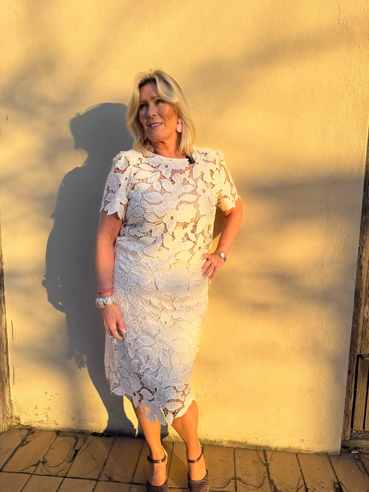 En stilfull och feminin kjol i vacker spets som ger en elegant och sofistikerad look. Kjolen har ett dekorativt blommönster i spetsen och en något asymmetrisk nederkant som skapar ett mjukt och levande fall. Den kroppsnära passformen framhäver silhuetten på ett smickrande sätt, samtidigt som fodret ger en bekväm känsla.